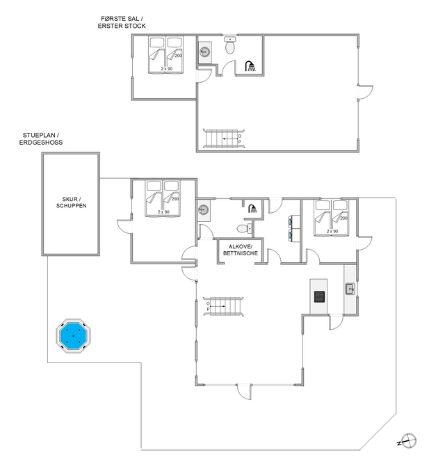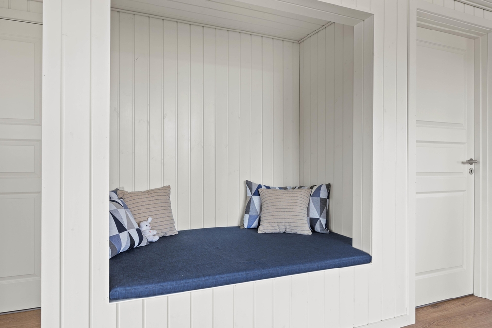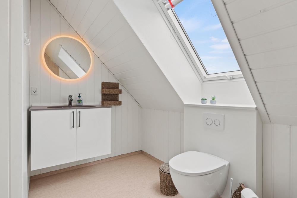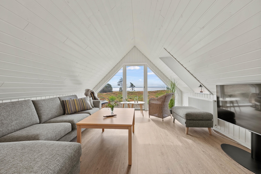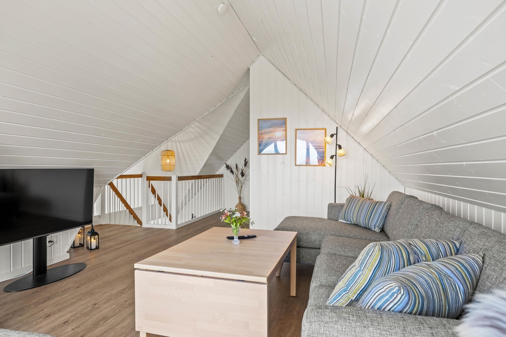 På førstesalen finder I det tredje soveværelse, endnu et badeværelse med gulvvarme og opholdsstuen. Stuen indbyder til hyggelige og afslappende stunder ? uanset om der er spilleaften eller en god film på programmet.