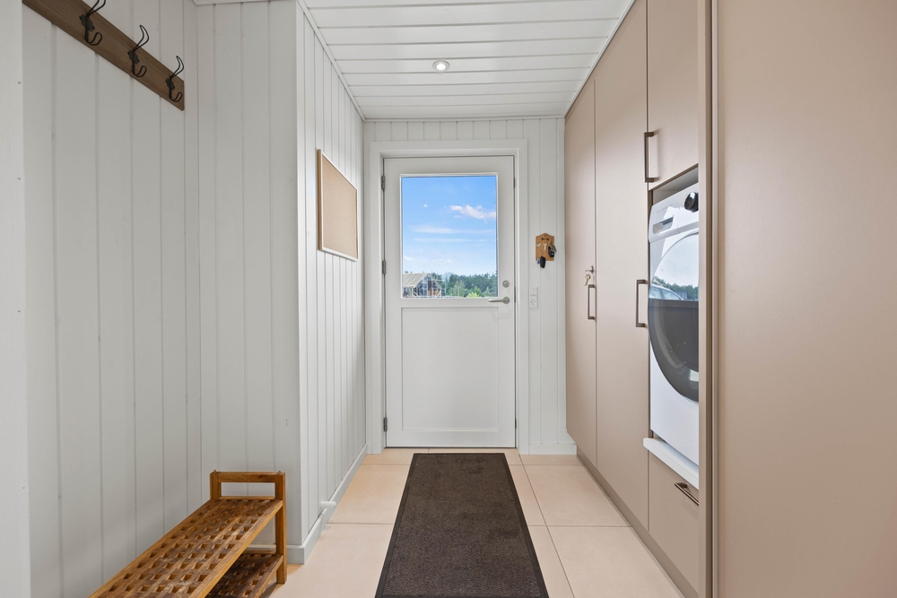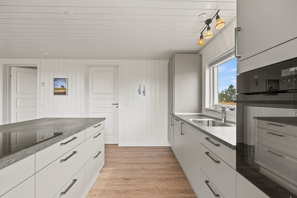 I stueetagen finder I det praktiske bryggers med kombi vaskemaskine/tørretumbler, sommerhusets ene badeværelse, 2 gode soveværelser og et stort alrum med køkken og spisestue i åben forbindelse. I køkkenet finder feriekokken, alt det man kunne tænke sig til at kreere lækre måltider! Alrummet er fyldt med hyggekroge, såsom alkoven der er perfekt til afslapning med en god bog eller vinduespladsen, hvorfra man kan beundre det smukke landskab.