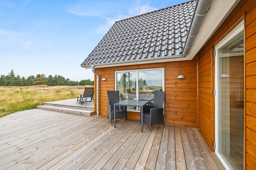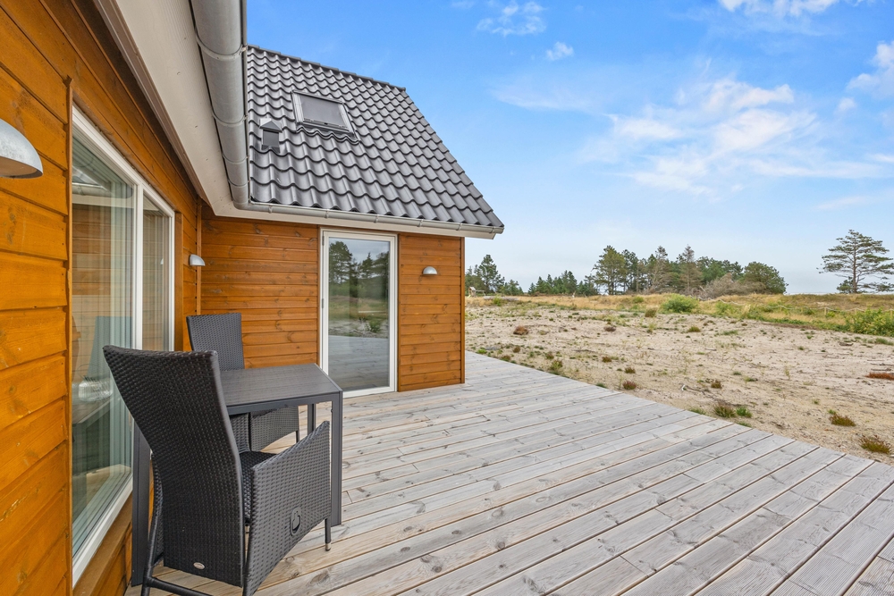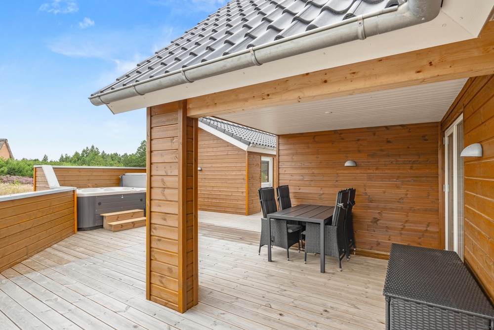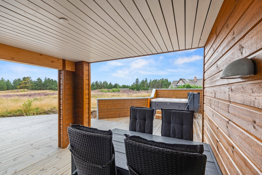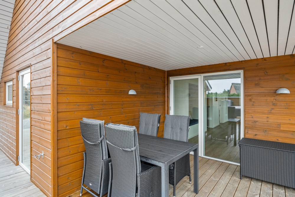 I får ikke kun et gennemført luksuriøst indre, men også et helt fantastisk udeområde med en stor, delvist overdækket træterrasse, som danner rammerne om udendørs aktiviteter. Her kan I nyde morgenkaffen eller slappe af i solen efter en dag fyldt med aktiviteter. Havemøbler, liggestole og gasgrillen står klar til jer!