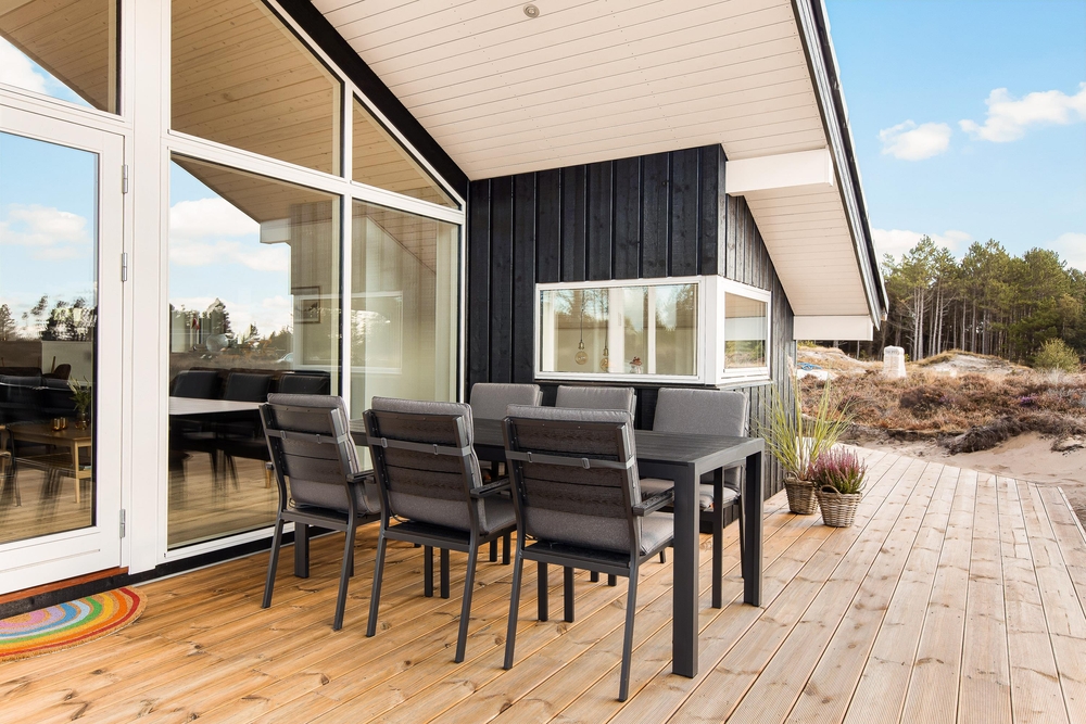 Sommerhuset på Chresten Krommes Vej 6 karakteriseres også ved den store naturgrund med afskærmet og delvist overdækket terrasse. Her kan du finde en skyggefuld plet, eller nyde middagssolen på liggestolen ? imens kan børnene bygge sandslotte i sandkassen eller lege på gyngerne.