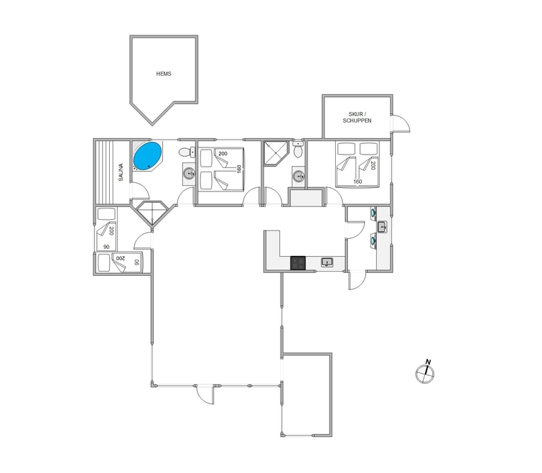 Der findes to værelser med dobbeltsenge, et værelse med to enkeltsenge og en hems med to foldemadrasser, hvor I kan I hvile ud og få en god nattesøvn efter at have været ude i den friske vesterhavsluft. De to badeværelser med gulvvarme gør, at I ikke behøver at stå i kø for at børste tænder om morgenen. Efter en lang dag på stranden i den friske luft, kan I slappe af i sauna og spa. Vaskemaskine og tørretumbler leverer friske håndklæder.