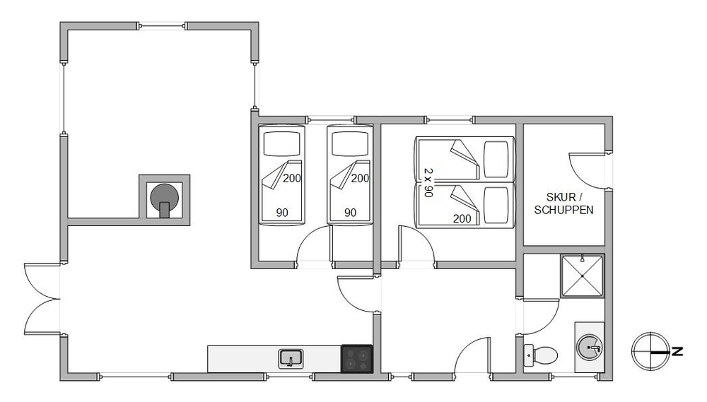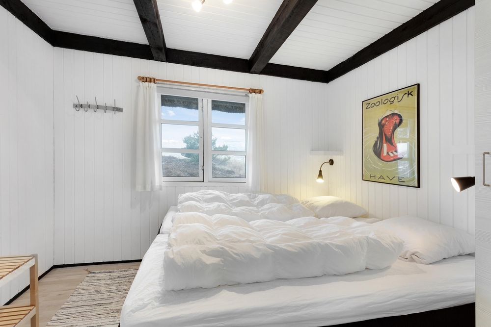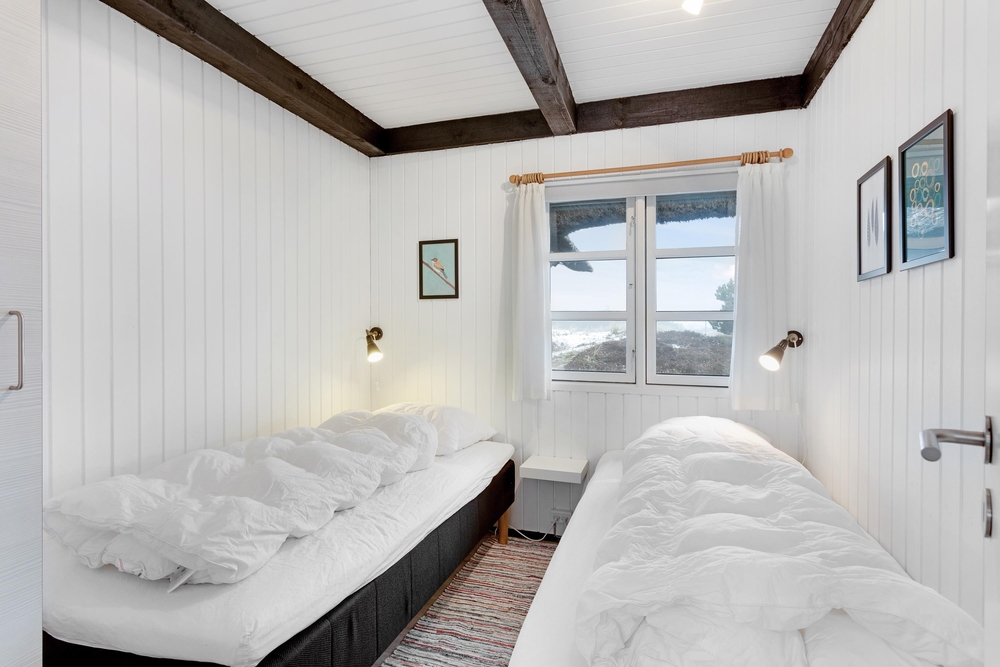 De to soveværelser indeholder henholdsvis en dobbeltseng og to enkeltsenge, hvor I kan hvile godt ud. Læg mærke til, at vesterhavsluften gør noget godt for nattesøvnen. Det moderne badeværelse med gulvvarme indeholder vaskemaskine og tørretumbler, så I kan friske håndklæderne op i løbet af ferien.