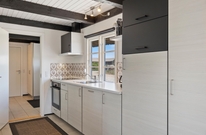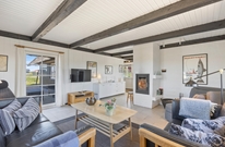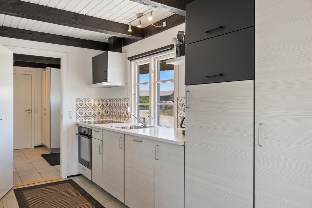 De lyse gulve, vægge og lofter og det fine lysindfald fra det brede vinduesparti giver en dejlig stemning i opholdsstuen. Her kan I trække jer tilbage med en god bog foran brændeovnen, eller I kan se en film sammen via Chromecast. Ved spisebordet kan I nyde dagens måltider i de charmerende omgivelser, eller I kan spille et brætspil. Det åbne køkken indeholder alt, hvad I behøver for at forkæle hinanden med lækre, hjemmelavede måltider, herunder også opvaskemaskine. Især lystfiskere vil glædes over den separate fryser på 100 l. Her kan nok være en fisk eller to.