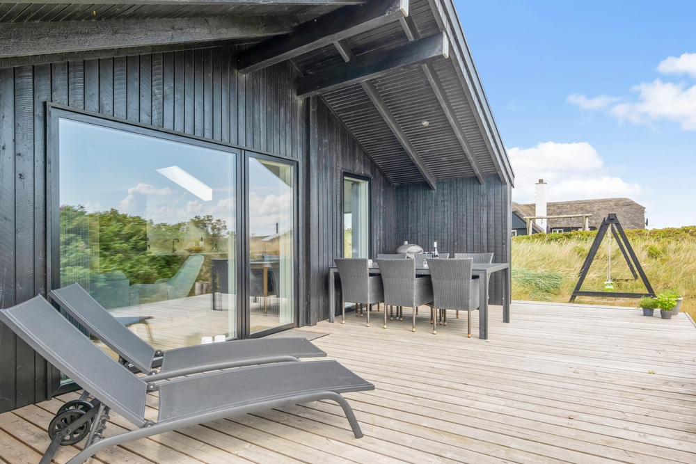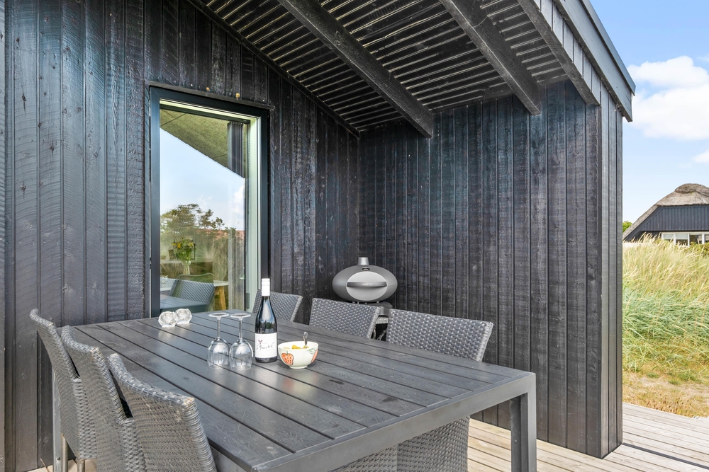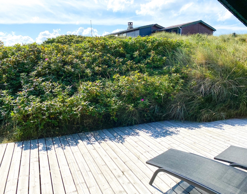 Udendørs venter jer en dejlig træterrasse, som I har direkte adgang til fra opholdsrummet. Terrassen løber hele vejen rundt om sommerhuset og er delvist overdækket og afskærmet, så I kan sidde i læ for vind og vejr.