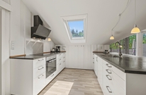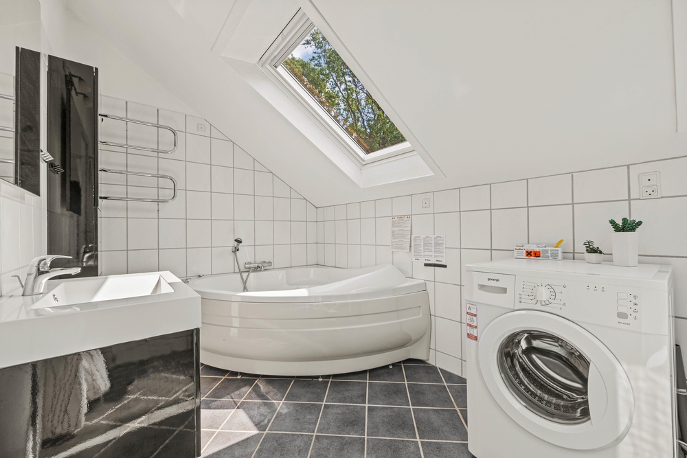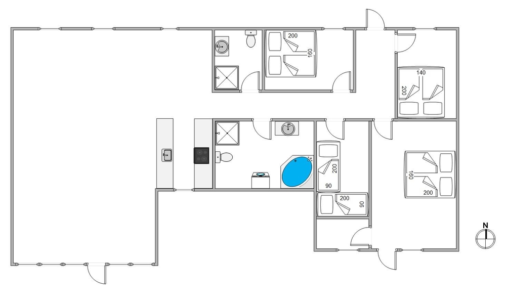 Samlingspunktet i det fantastiske feriehus er det store åbne plan. I kan lave mad sammen i det åbne køkken, tilbringe hyggelige timer ved spisebordet og runde aftenerne af i sofaområdet. Der er flere siddemuligheder, så alle gæster kan finde en hyggelig plads. Takket være den energibesparende varmepumpe kan du altid opretholde en behagelig temperatur i rummet. Der er ikke lang kø foran badeværelserne, da der er 2 badeværelser med gulvvarme til rådighed. Efter en lang gåtur på stranden kan du få varmen og slappe af i husets spabad, som ligger i det store badeværelse.
