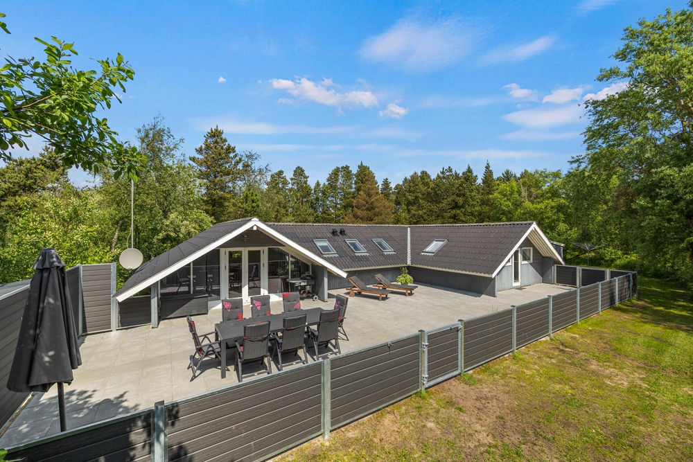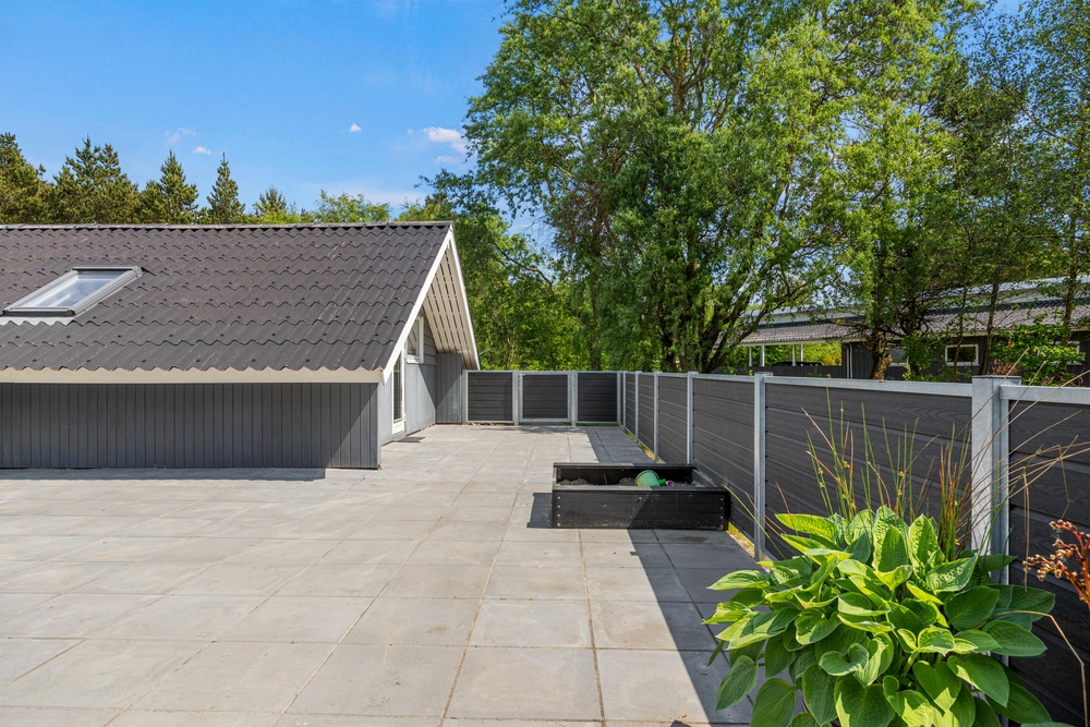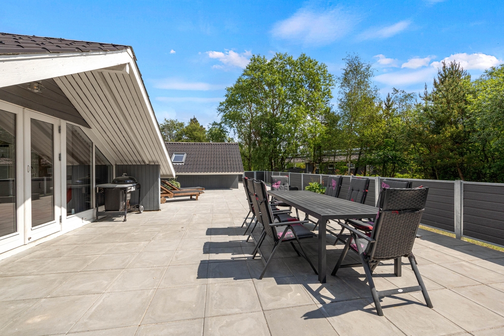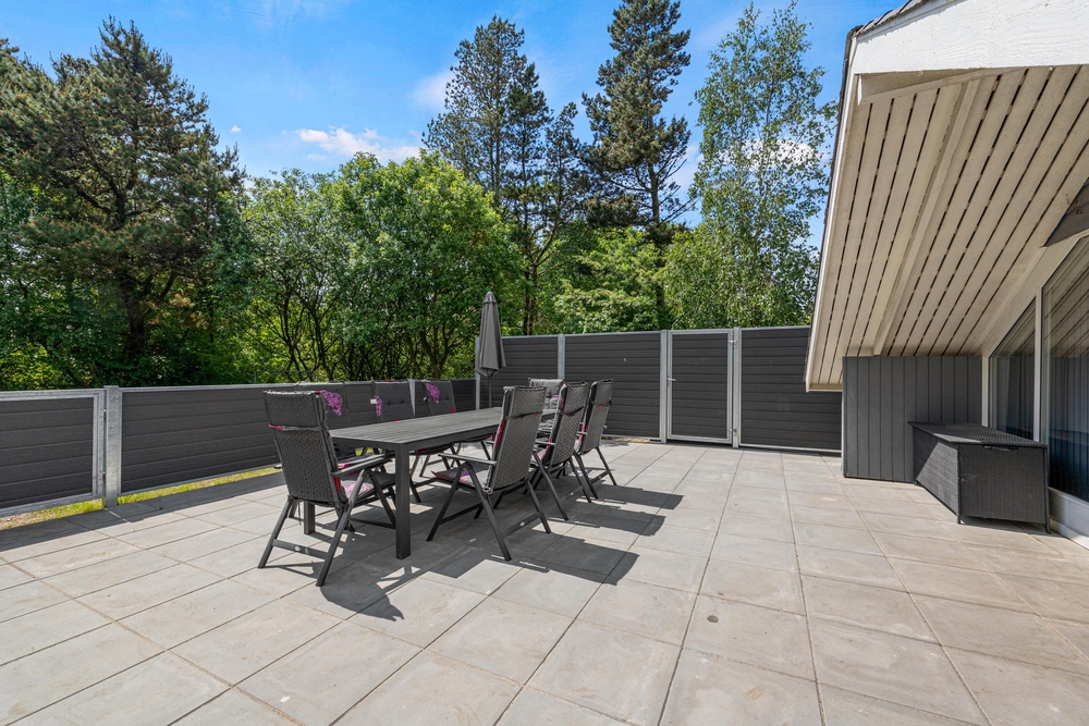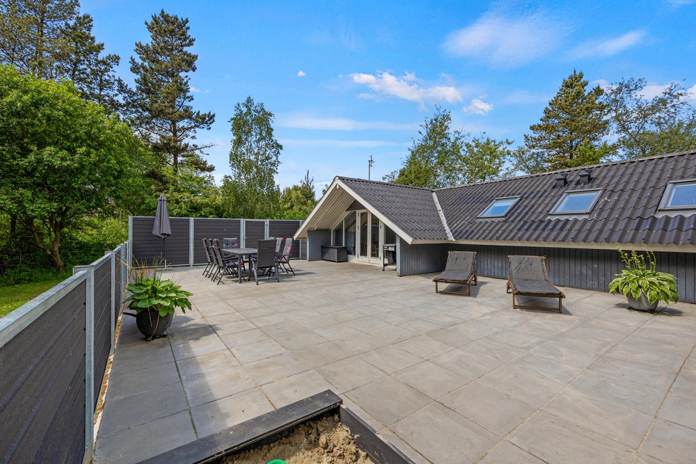 Det lyse opholdsrum fører direkte ud til den store terrasse. Du kan roligt lade dørene stå åbne, for hele terrassen er lukket, så hverken de små børn eller hundene kan udforske omgivelserne på egen hånd. Det betyder, at du kan slappe af, mens børnene leger i sandkassen på terrassen. Foran det indbydende feriehus finder du også en lukket terrasse, hvor du kan trække dig tilbage. I forhaven kan du lege og løbe rundt med børnene, eller nyde en frisk kop kaffe, mens børnene har det sjovt på trampolinen.