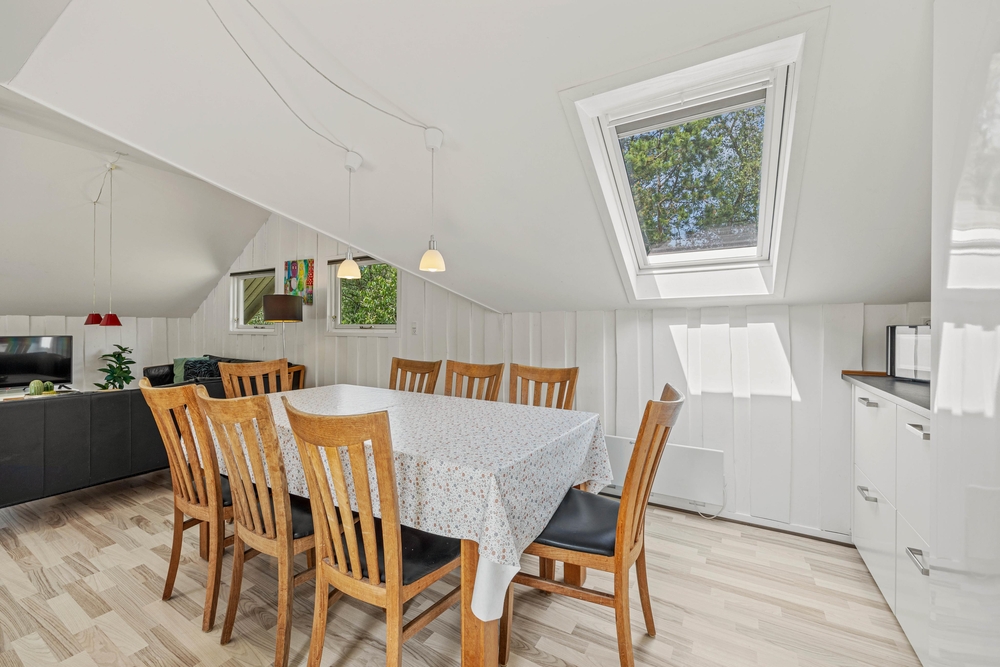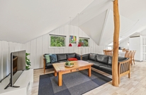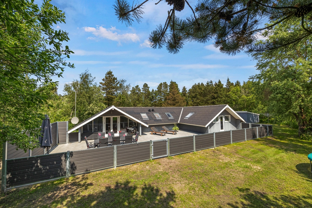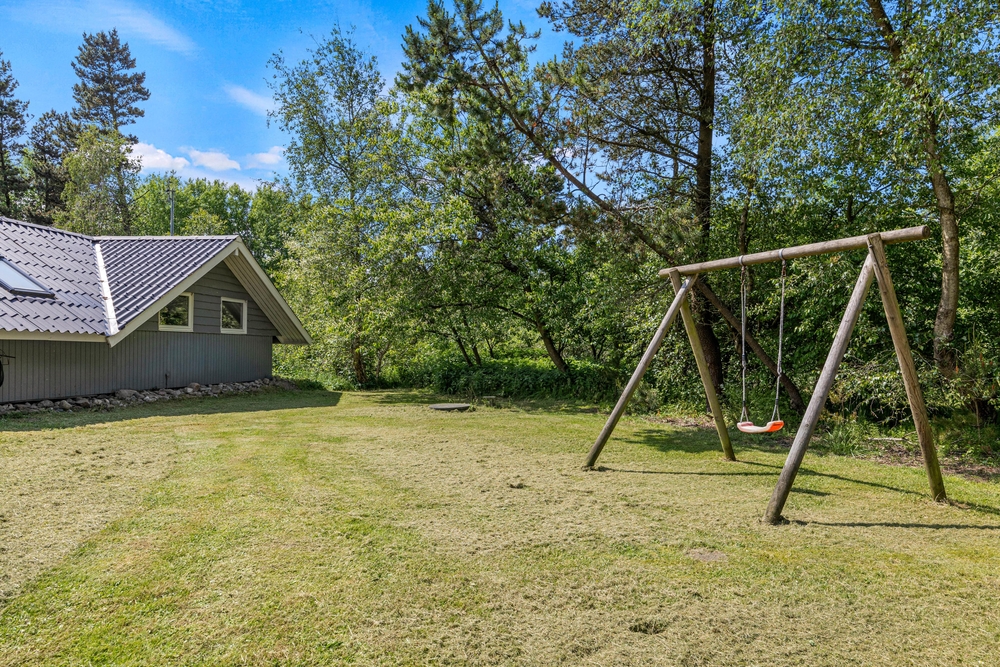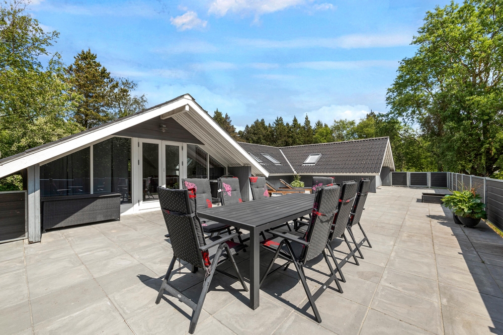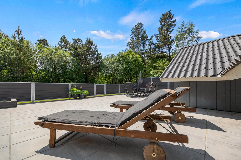 Det lyse opholdsrum fører direkte ud til den store terrasse. Du kan roligt lade dørene stå åbne, for hele terrassen er lukket, så hverken de små børn eller hundene kan udforske omgivelserne på egen hånd. Det betyder, at du kan slappe af, mens børnene leger i sandkassen på terrassen. Foran det indbydende feriehus finder du også en lukket terrasse, hvor du kan trække dig tilbage. I forhaven kan du lege og løbe rundt med børnene, eller nyde en frisk kop kaffe, mens børnene har det sjovt på trampolinen.