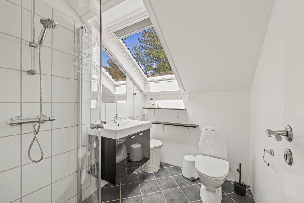 Indkørslen er bred, så der kan holde flere biler. Man kommer ind i det smukke feriehus via den lukkede terrasse foran indgangsdøren. Her er 132 velindrettede m² til i alt 8 feriegæster og 2 hunde. Soveværelserne er hyggeligt indrettet, og ovenlysvinduerne giver masser af lys i alle rum. Der er i alt 8 komfortable sovepladser, fordelt på 2 soveværeler med 2 dobbeltsenge og 2 soveværelser med 2 enkeltsenge.