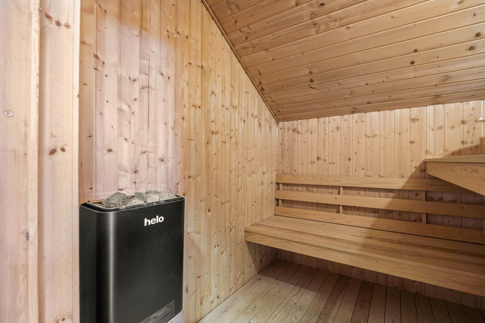 Sommerhusets rummelige badeværelse er udstyret med gulvvarme, vaskemaskine og tørretumbler. Her finder I også et af feriehusets highlights ? nemlig saunaen. Her kan I nyde varmen og slappe af efter en lang gåtur ved vandet på en blæsende efterårsdag.