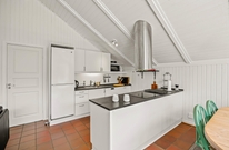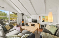 Sommerhusets hjerterum er alrummet, hvor køkken, spiseplads og stue ligger samlet i ét. Køkkenet og stuen er kun adskilt af en køkken-ø. Her kan du altså stå og kokkerere samtidig med, at du kan have kontakt til resten af familien, der slapper af foran brændeovnen i sofaen med en god film. I sommerhuset er der enkelte danske tv-kanaler. Som et ekstra plus er der også en varmepumpe, som I kan bruge til at holde et godt indeklima.