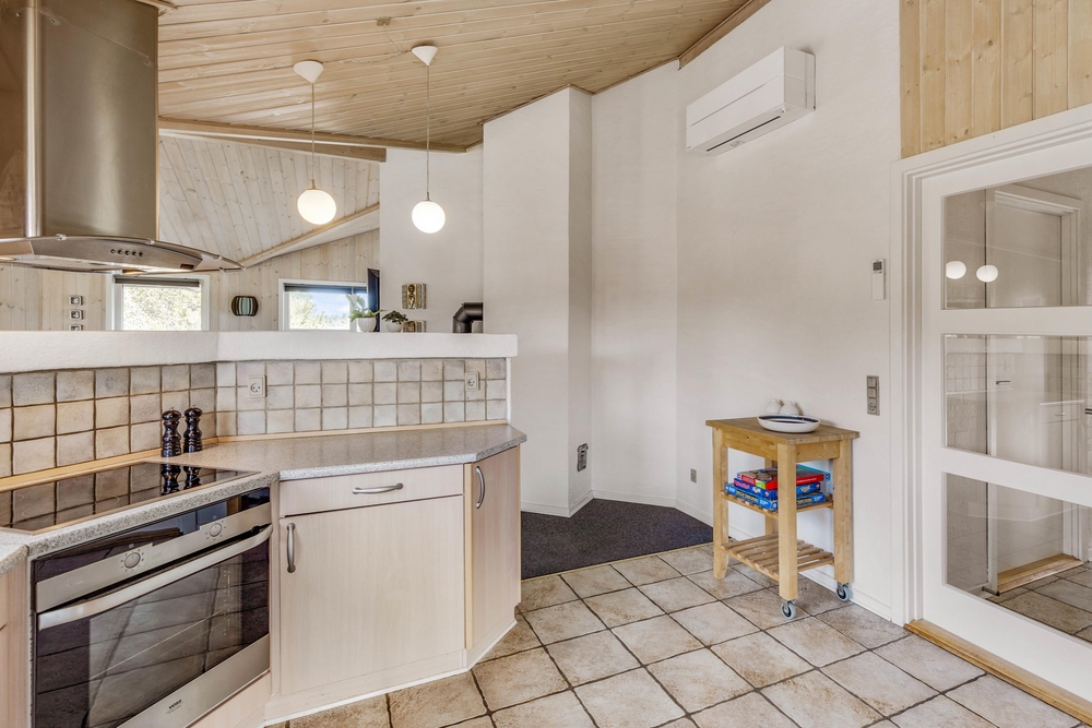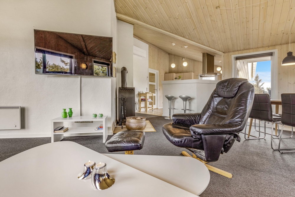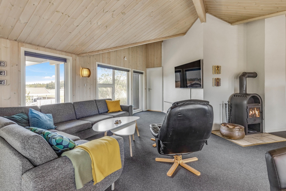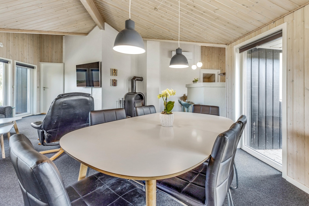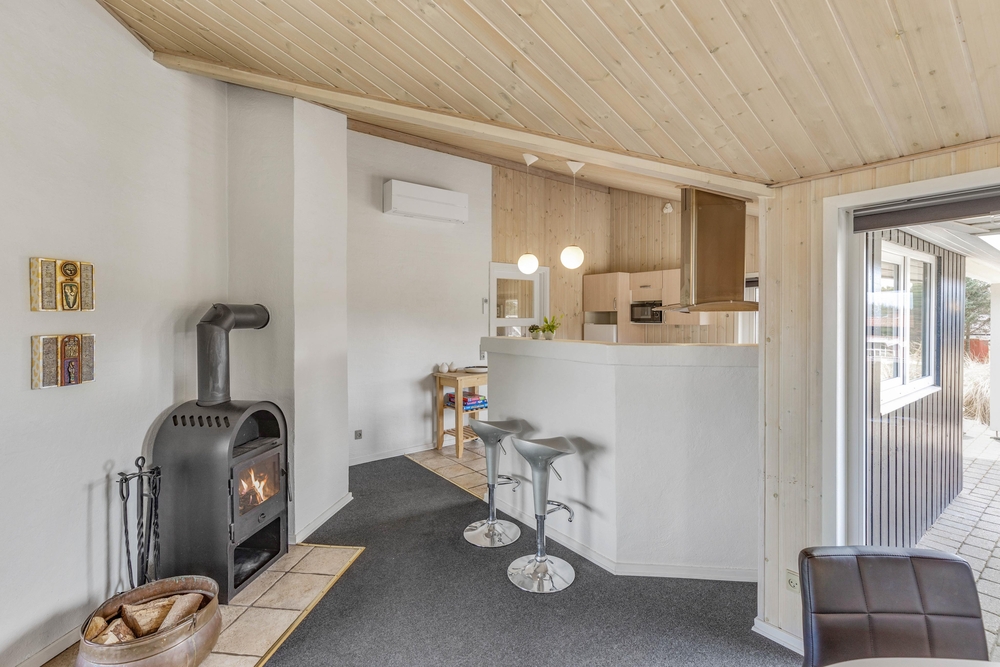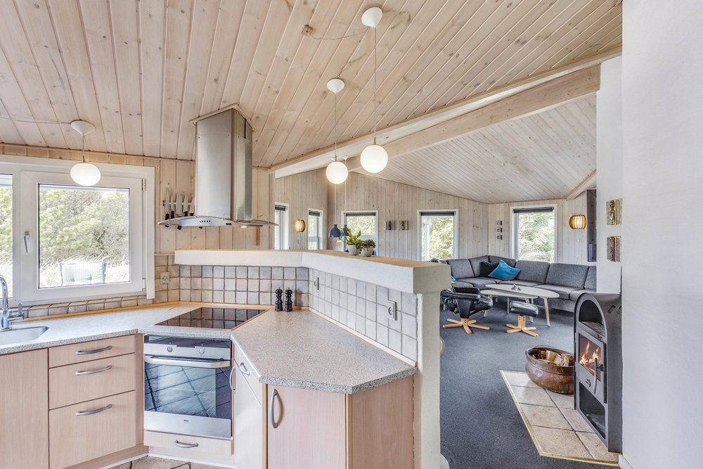 Jeres samlingspunkt og hjertet i feriehuset er alrummet, hvor køkken, stue og spiseplads ligger i åben forbindelse. Her har I både mulighed for at slappe af og nyde hyggelige feriestunder med hele familien. Om I laver mad, spiller spil eller ser film, sørger brændeovnen for at fuldende feriestemningen med sine knitren og varme.