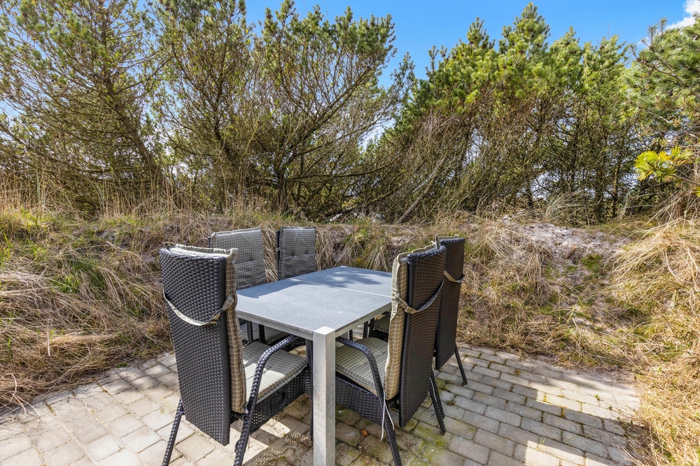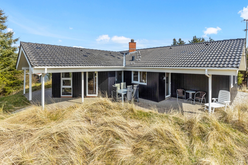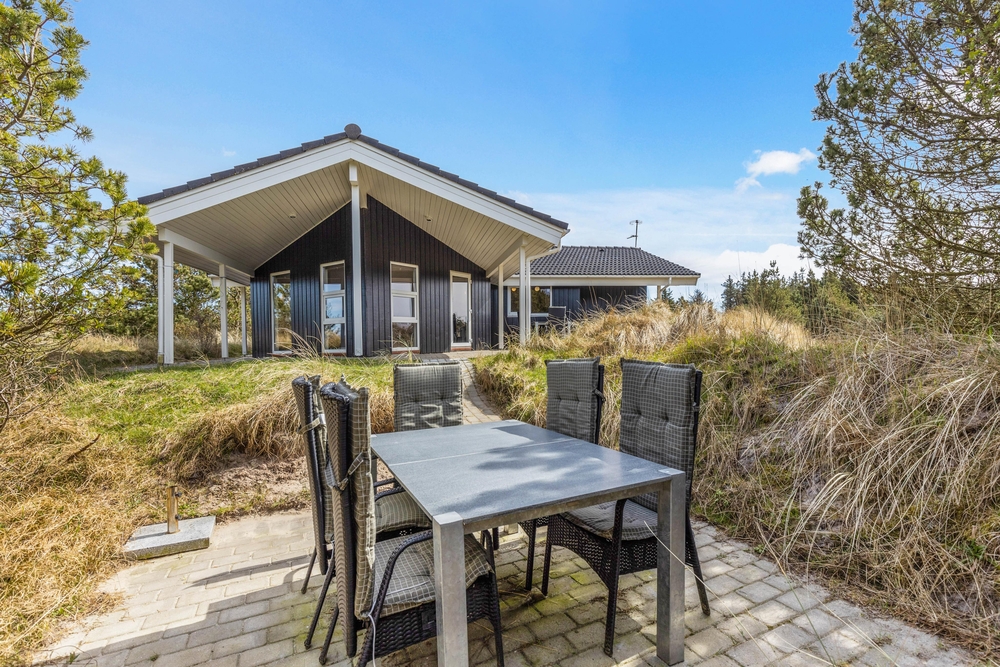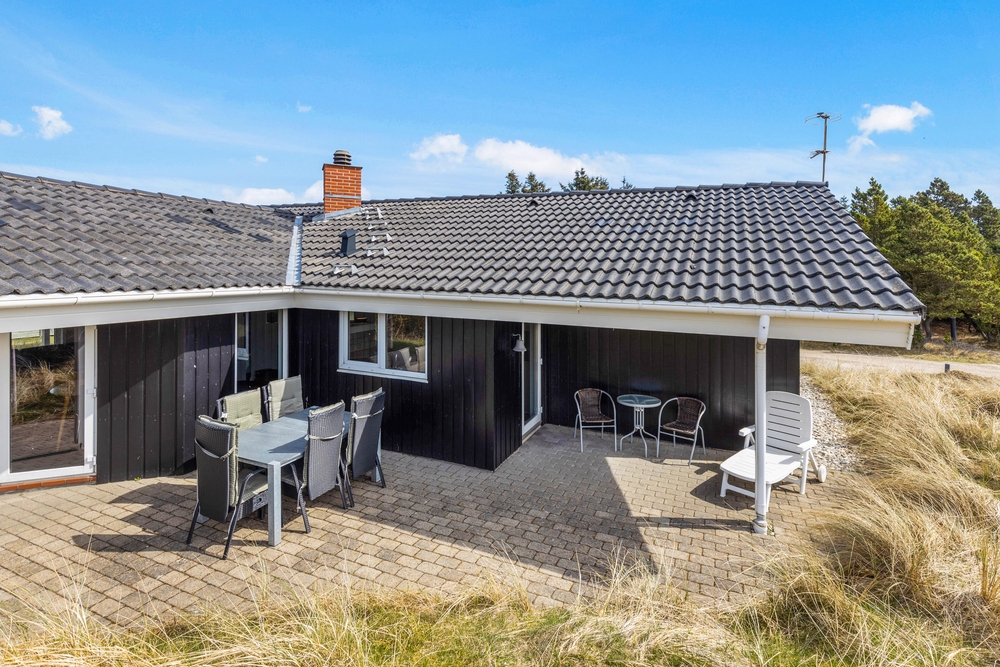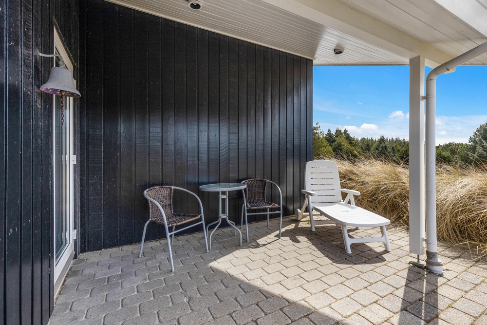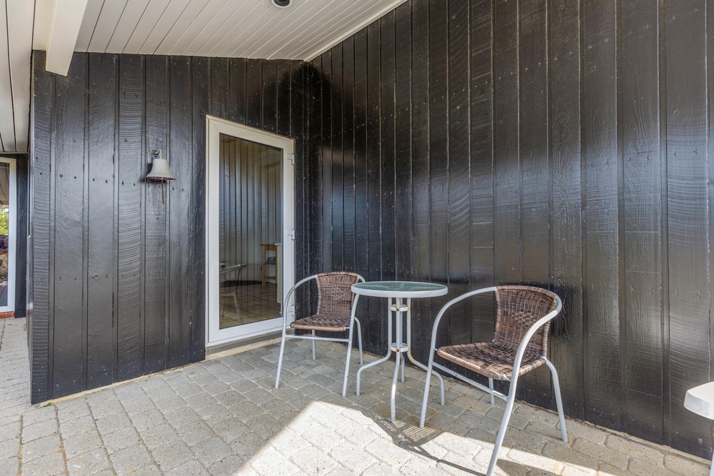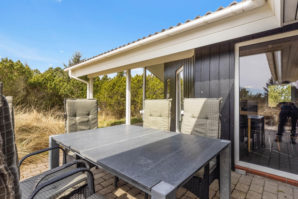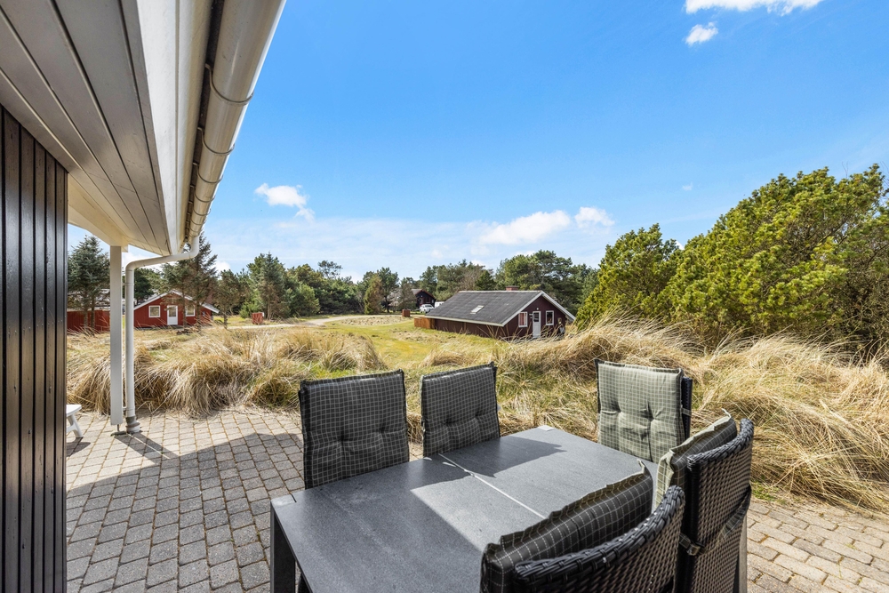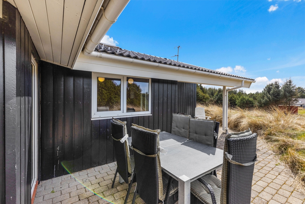 Fra sommerhuset kan I træde ud på den skønne terrasse, der er delvist overdækket ? det oplagte sted at tilbringe de varme og solrige feriedage. På terrassen står der både havemøbler og liggestole klar til jer, så I kan finde jer godt til rette og slappe af på en god plads i solen. Skulle I trænge til en pause fra solen, kan I sætte jer under terrassens overdækkede del.