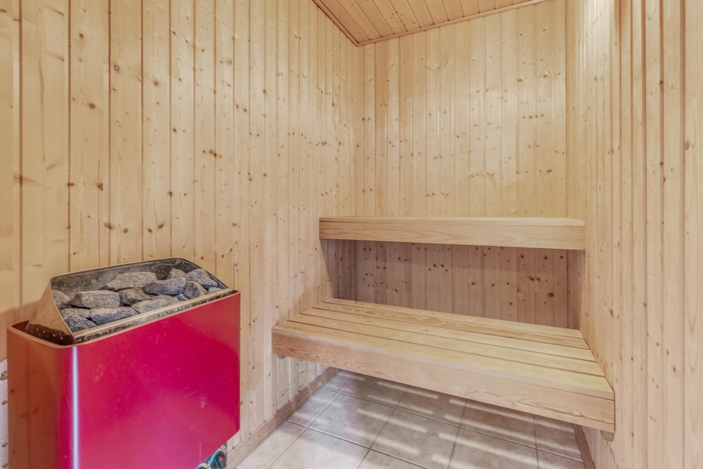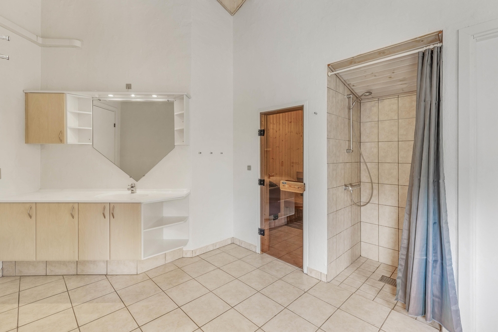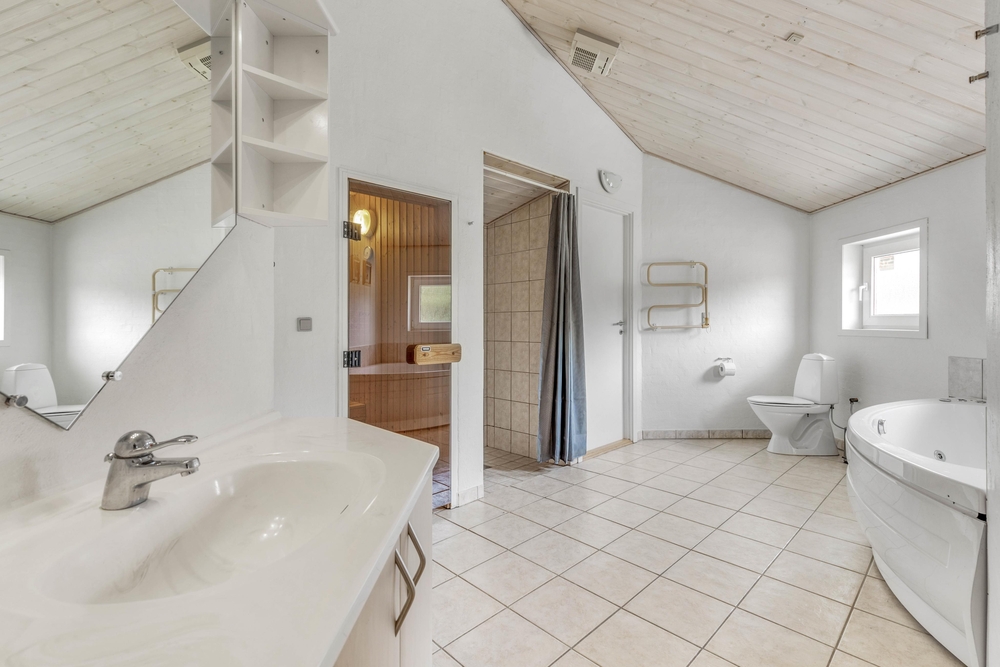 På badeværelset venter jer først og fremmest et skønt spabad, hvor I kan læne jer tilbage og lade det varme, boblende vand forkæle jeres kroppe med masser af afslapning. Derudover venter jer også en dejlig sauna, hvor I kan sætte jer til rette i varmen og komme helt ned i gear.