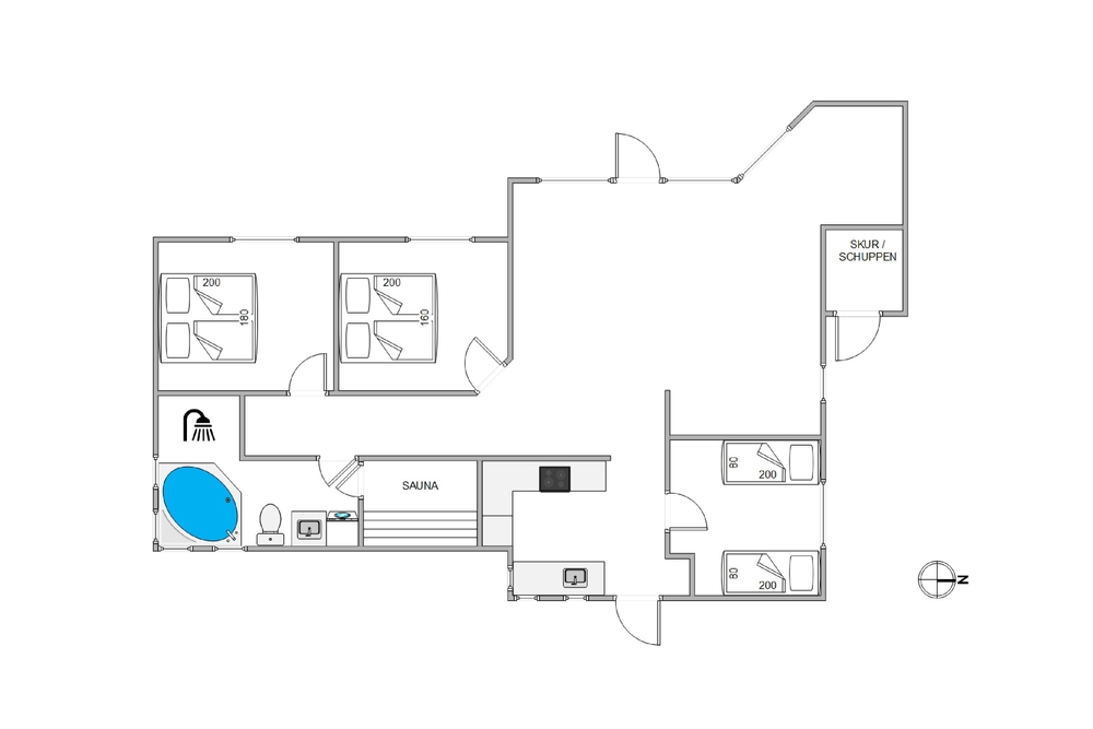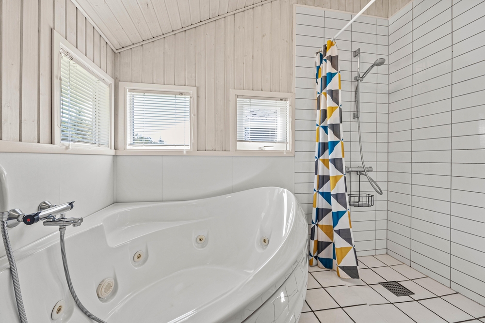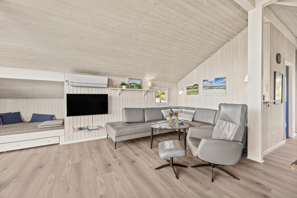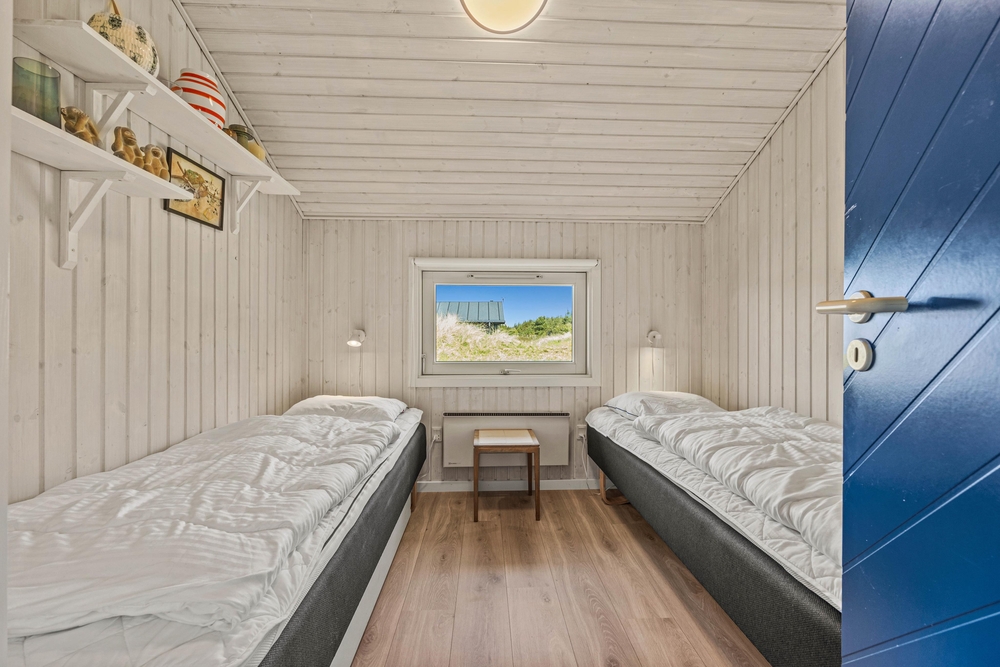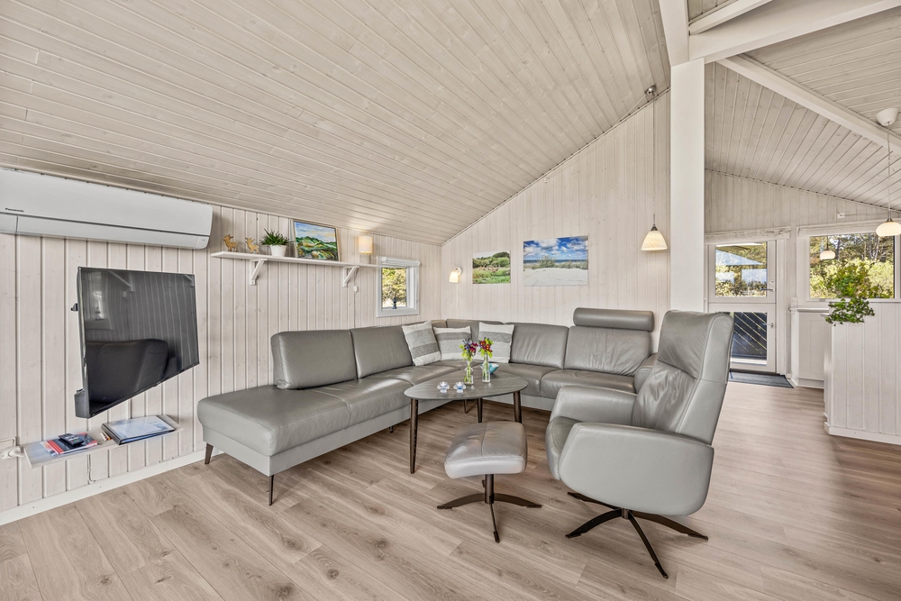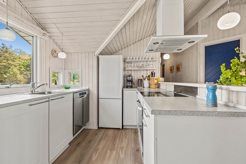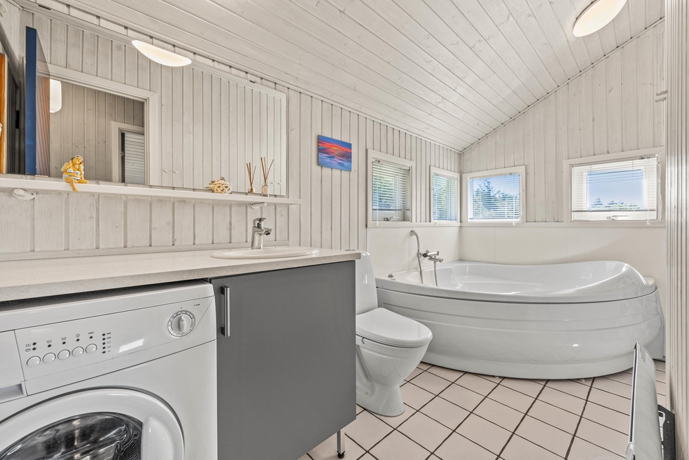 På badeværelset med gulvarme venter jer sauna og spa. Her er der mulighed for afslapning og børnene vil helst sikkert også elske at sidde i det varme vand. Udover badeværelset finder I også tre fine soveværelser ? alle med gode senge og opbevaringsmulighed. Feriehuset er udstyret med både varmepumpe, opvaskemaskine og vaskemaskine til at klare de huslige pligter.