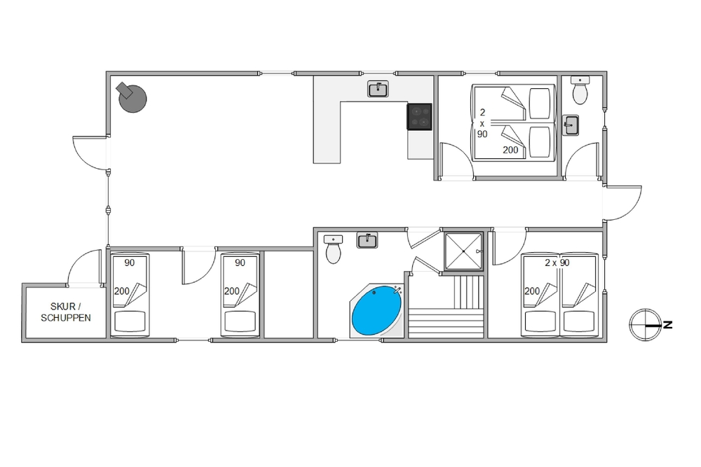 Som en ekstra luksus har I på Engesøvej 4 jeres egen lille wellness-afdeling. I badeværelset er både 2-personers spa og en skøn sauna, så I har muligheden for rigtigt at slappe af og blive gennemvarmet efter en lang dag i den friske havluft. Et gæste-wc sørger for at den gode stemning holder, ? også om morgenen, når alle hurtigt vil gøre sig klar til endnu en dejlig dag ved stranden.