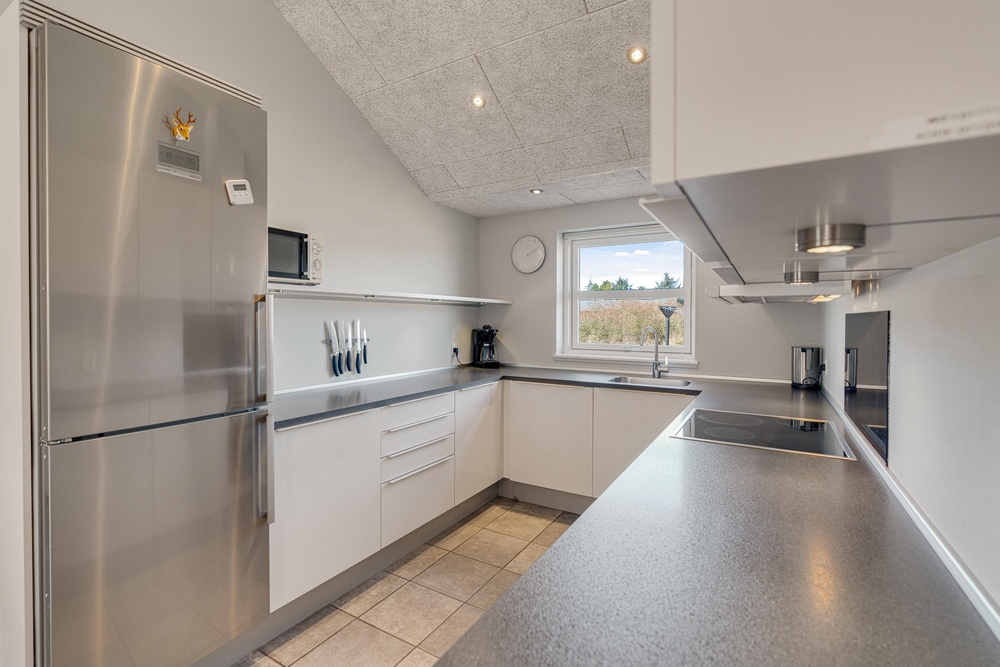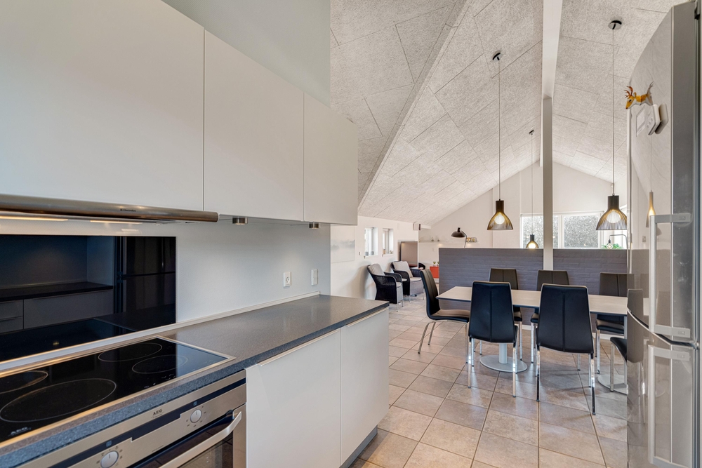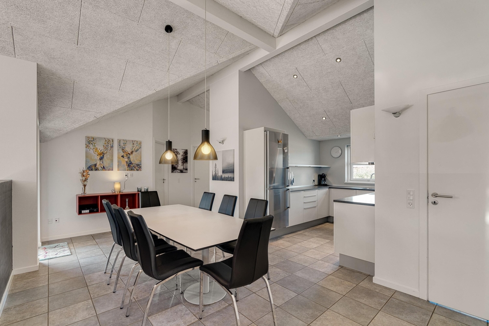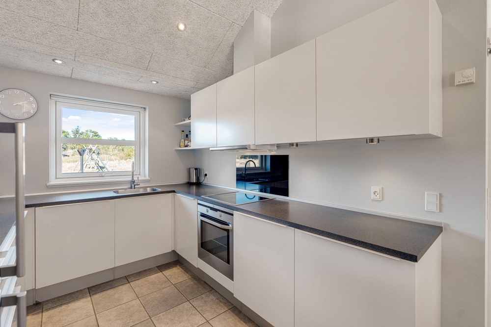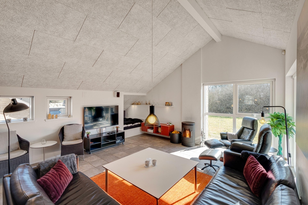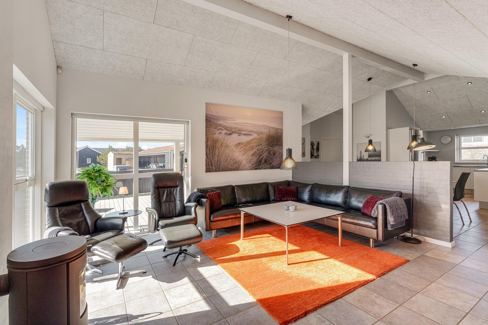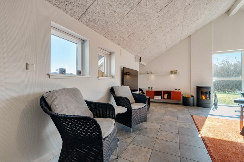 Sommerhusets køkken, stue og spiseplads ligger i åben forbindelse og danner tilsammen alrummet, som vil blive jeres store samlingspunkt på ferien. Her kan I være sammen om at lave mad, spille spil og se film. Brændeovnen sørger for at sprede en dejlig varme og er samtidig med til at fuldende den hyggelige feriestemning. I stuen har I desuden gulvvarme.