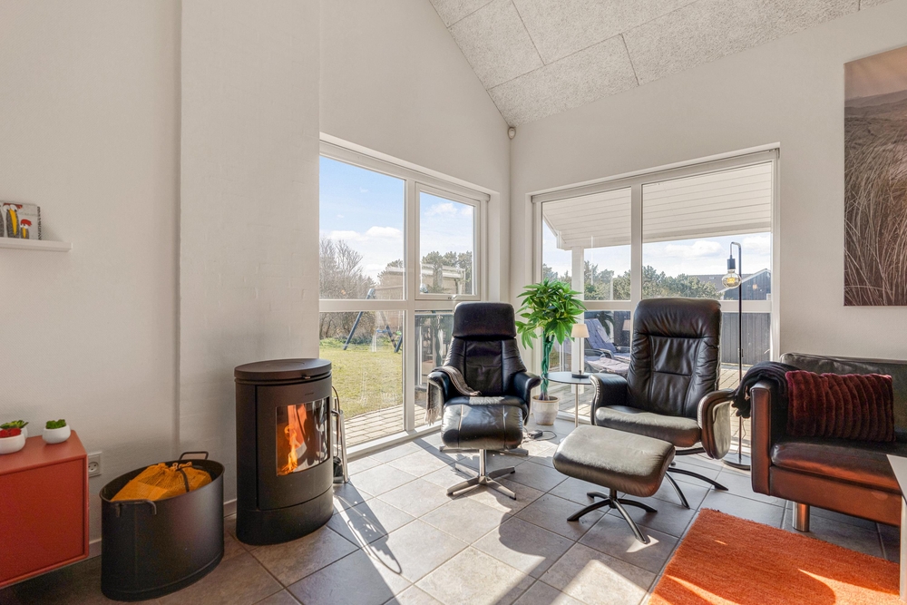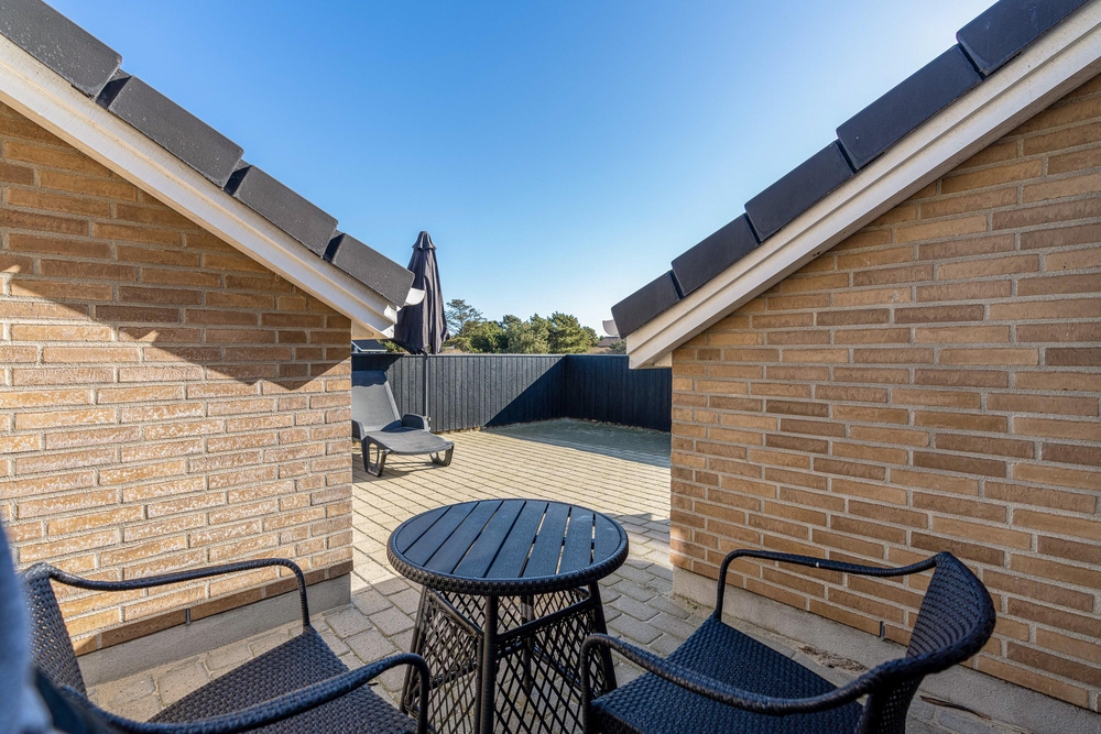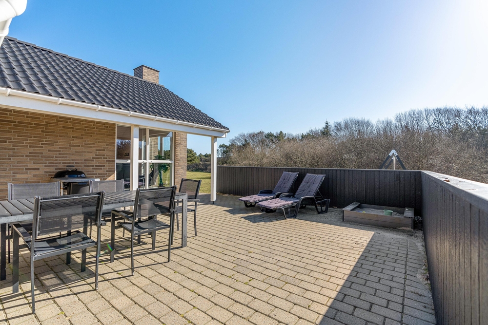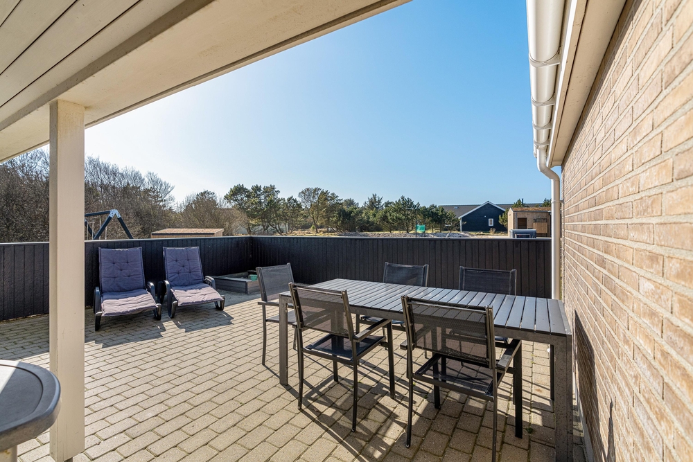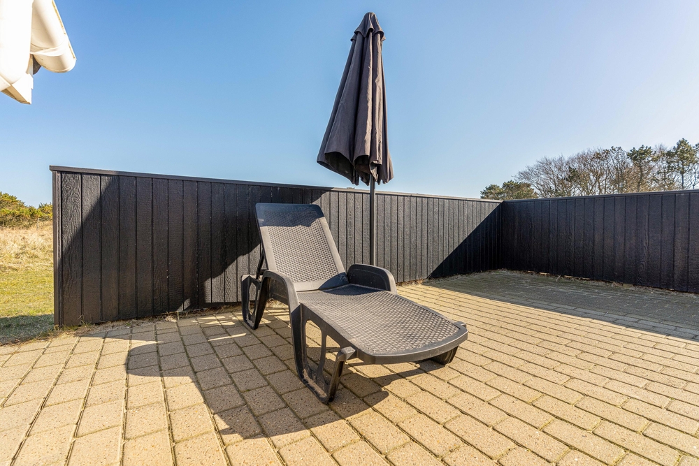 Udendørs venter jer en skøn terrasse, som I kan nyde de solrige feriedage på. Terrassen er åben, og her har I både havemøbler og liggestole til rådighed, som I kan finde jer til rette i med en god bog på et godt solspot.