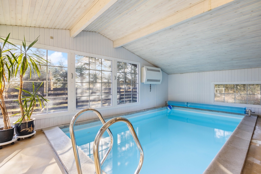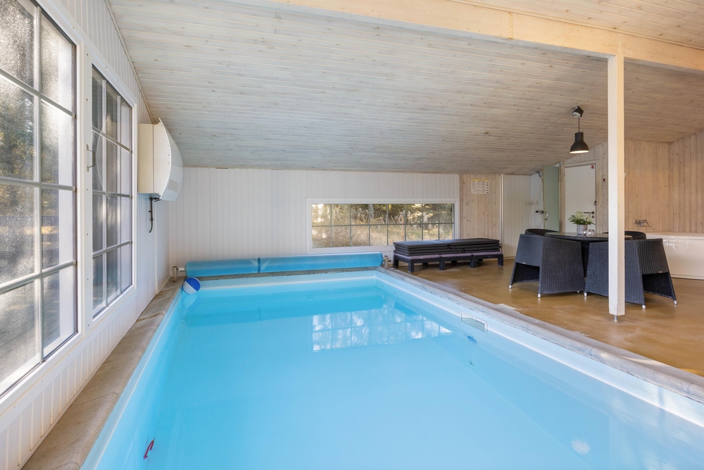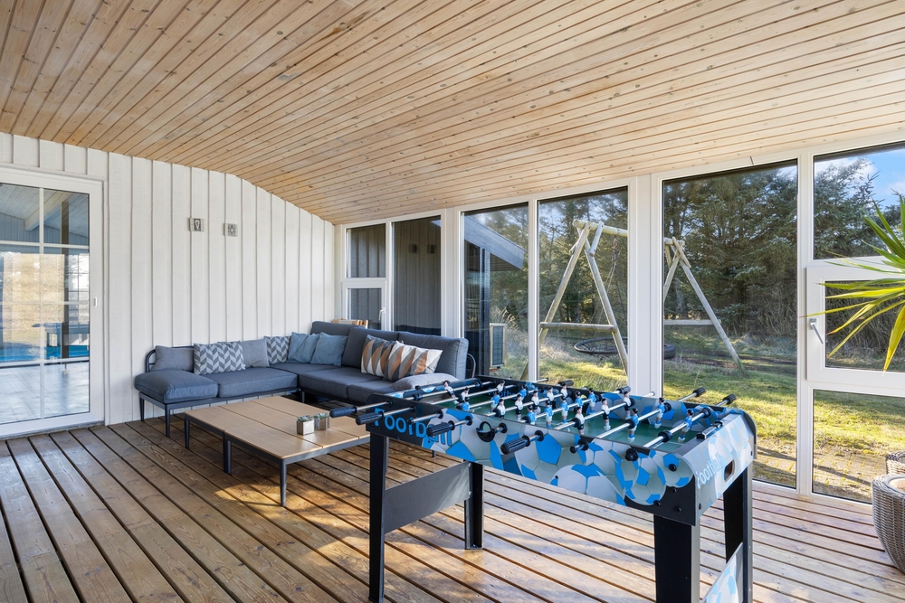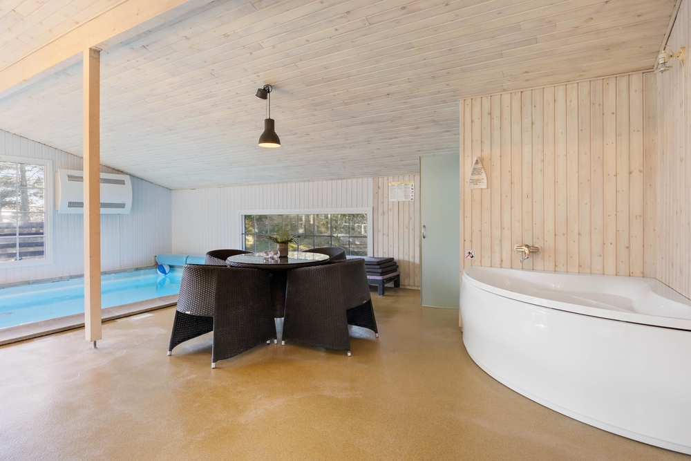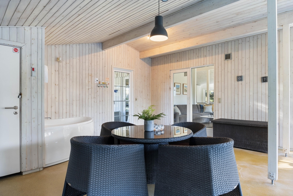Fra poolrummet er der udgang til feriehusets hyggelige udestue, hvor I kan sætte jer med aftenkaffen eller læse en god bog i fred og ro. Feriehuset har også både vaskemaskine og tørretumbler til rådighed, så I altid har rent og tørt tøj. Det er også muligt at opvarme huset med den energibesparende luft til luft varmepumpe.