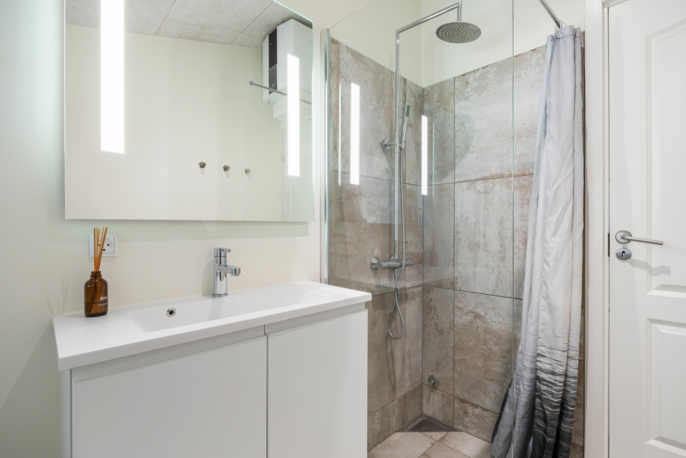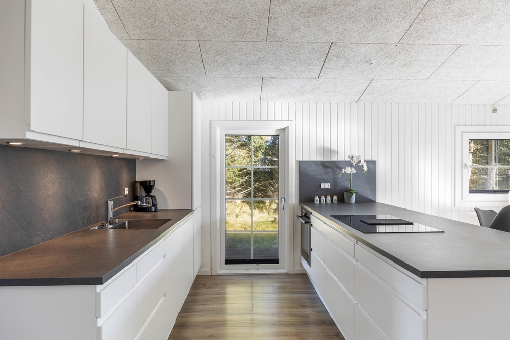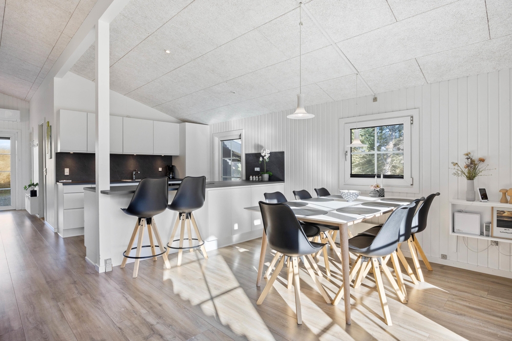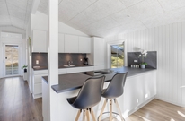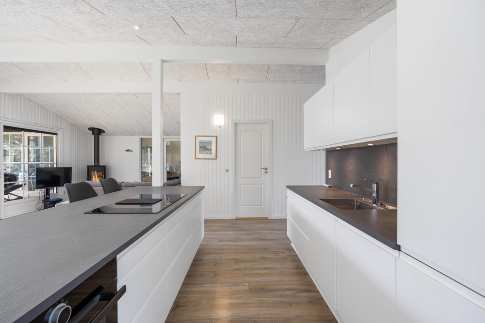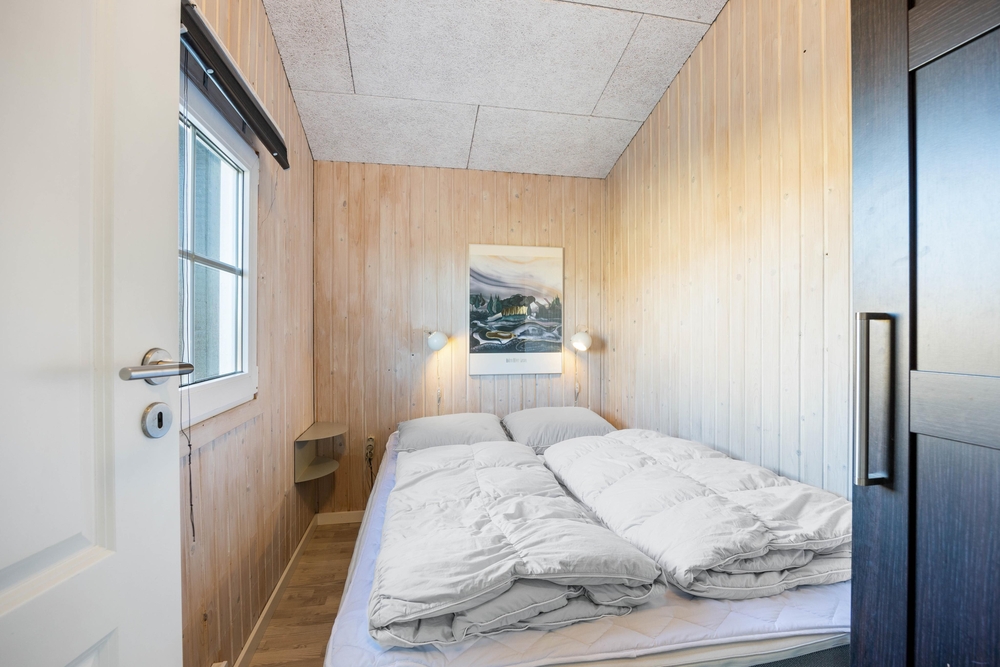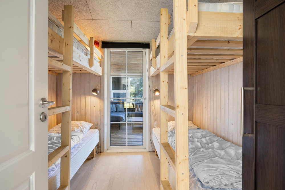 Fra entréen møder jer først de 3 soveværelser og husets badeværelser. Soveværelserne er indrettet med henholdsvis 2 dobbeltsenge og 2 køjesenge. Husets badeværelset har behagelig gulvvarme, så I ikke skal fryse om fødderne. Fra entréen og værelserne fører gangen videre hen til husets samlepunkt, nemlig det store køkkenalrum.