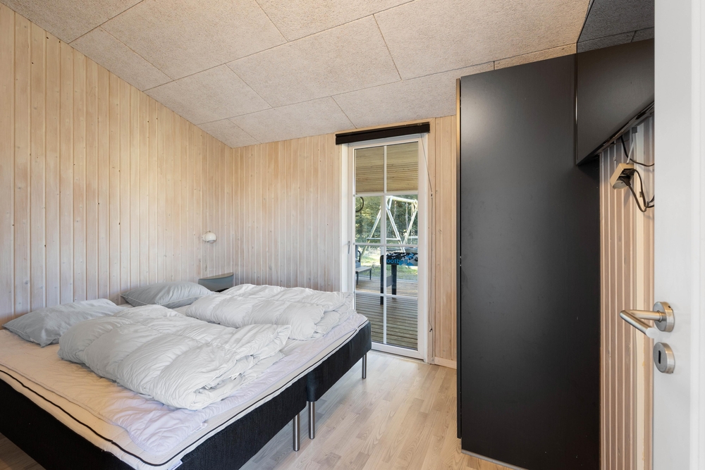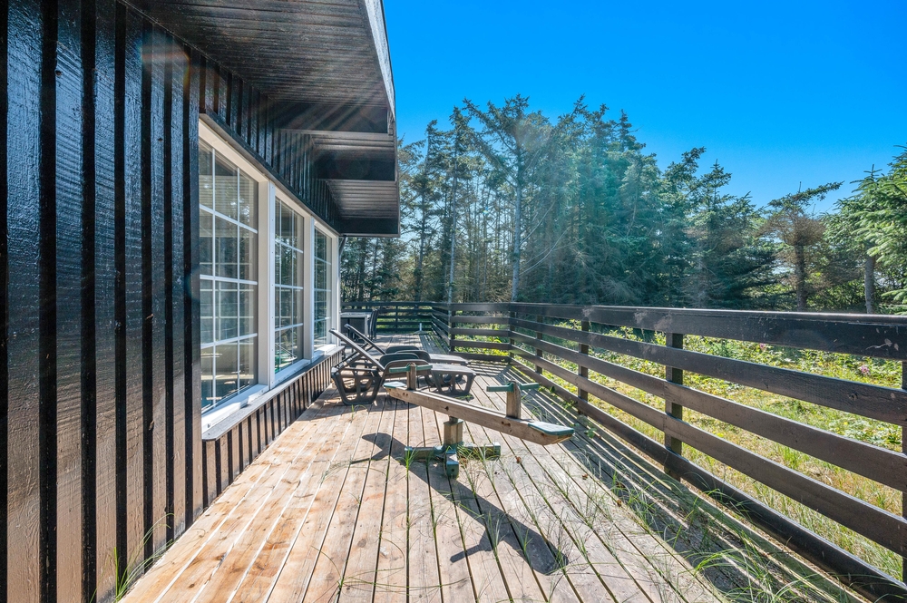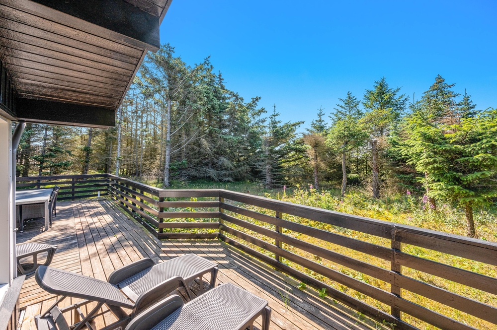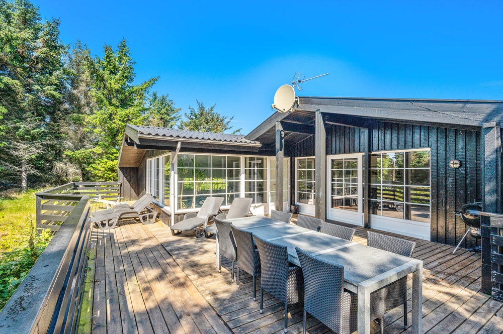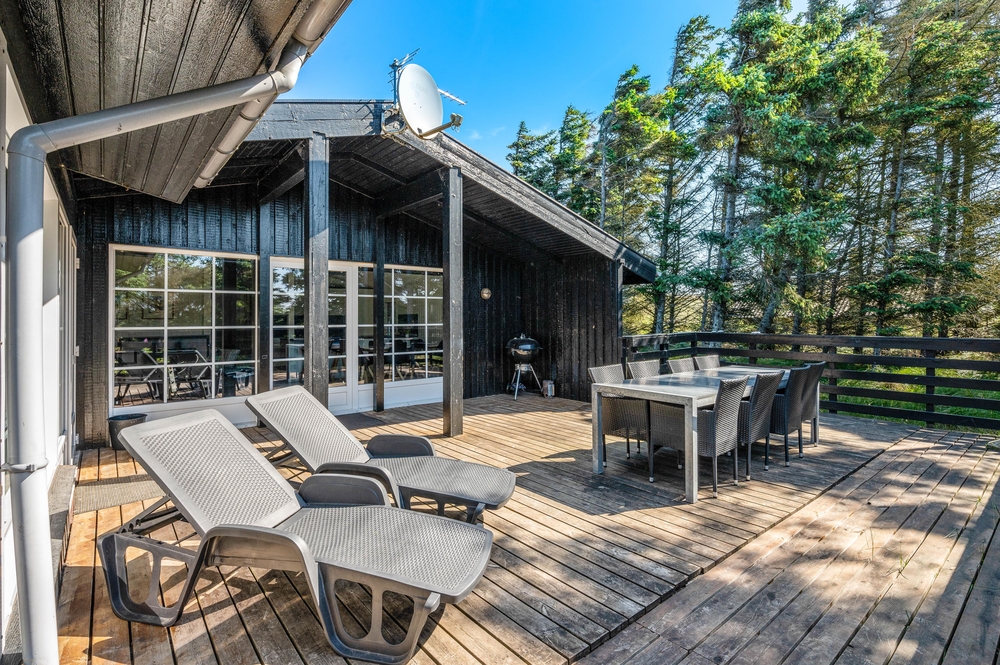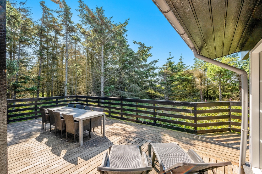 Feriehuset på Fladsbjergvej 32 har en dejlig lukket træterrasse, hvor de mindste og hunden kan løbe frit. Her kan I også sidde afskærmet i læ og nyde morgenkaffen med solopgangen i øst. Terrassen er omringet af en grøn plæne og træer, så I kan være i fred og ro. Ved huset er der også et gyngestativ og redskabsrum.