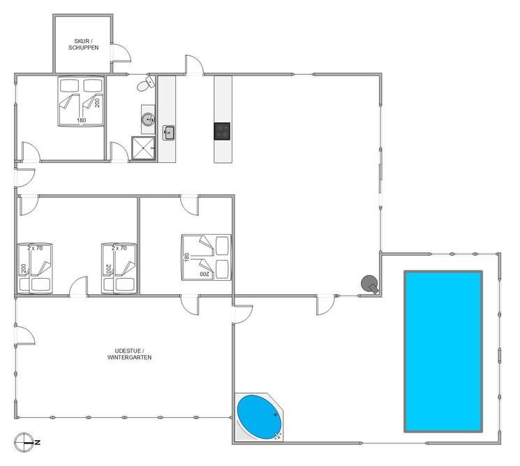 Fra stuen er der udgang til poolrummet med stor swimmingpool og spa. Her kan, især de mindste, tilbringe mange timer med sjov og leg og de voksne kan også være med. Læn jer tilbage i spaen efter en frisk og begivenhedsrig dag på Vestkysten, og lad de små brænde det sidste krudt af i poolen inden sengetid.