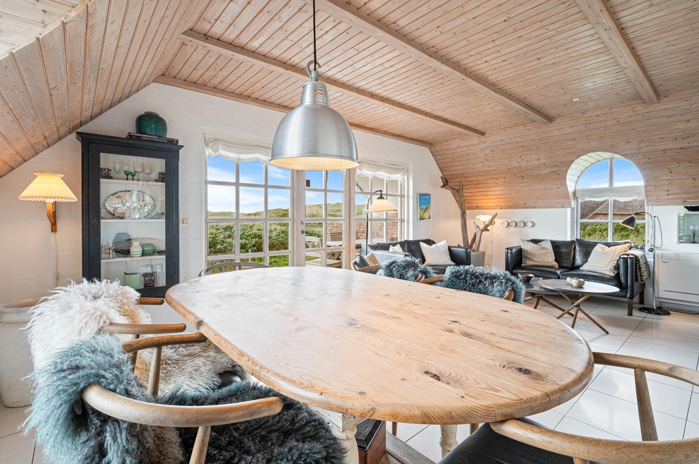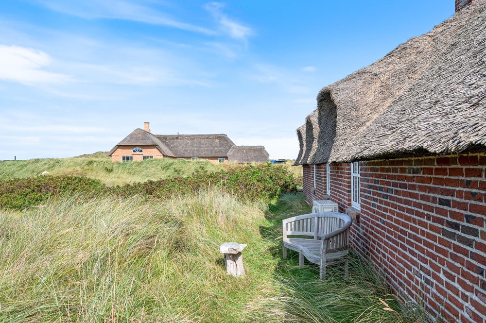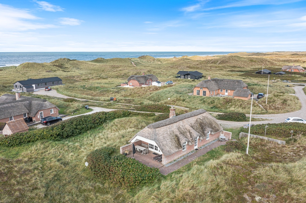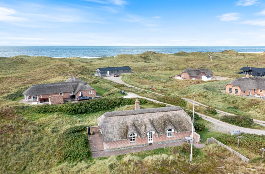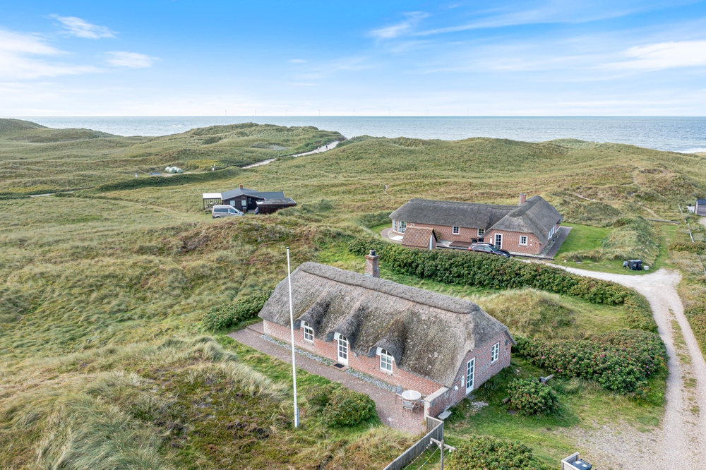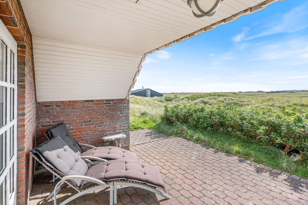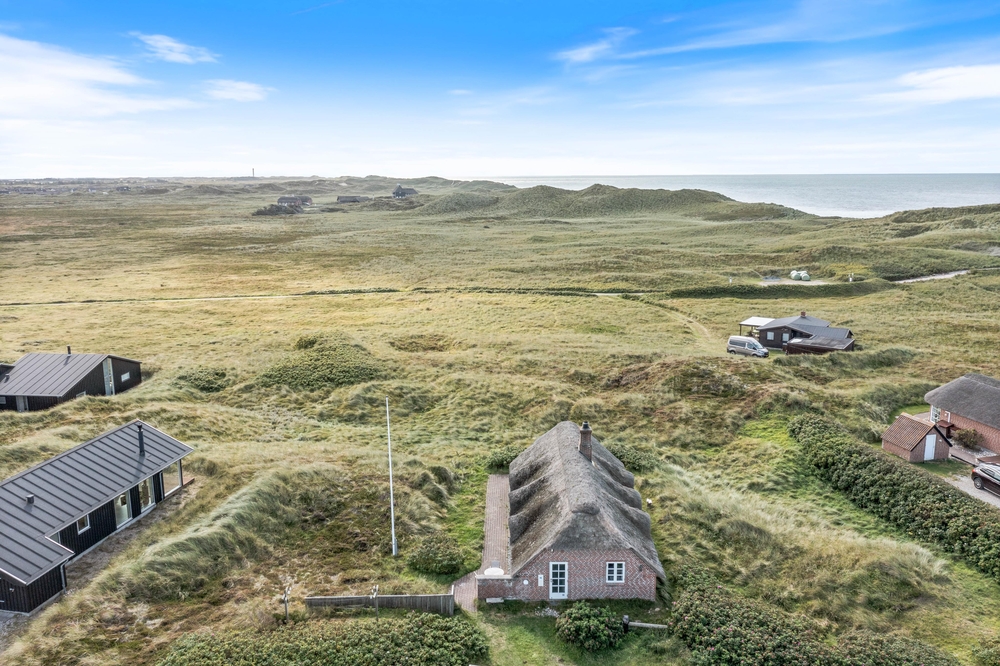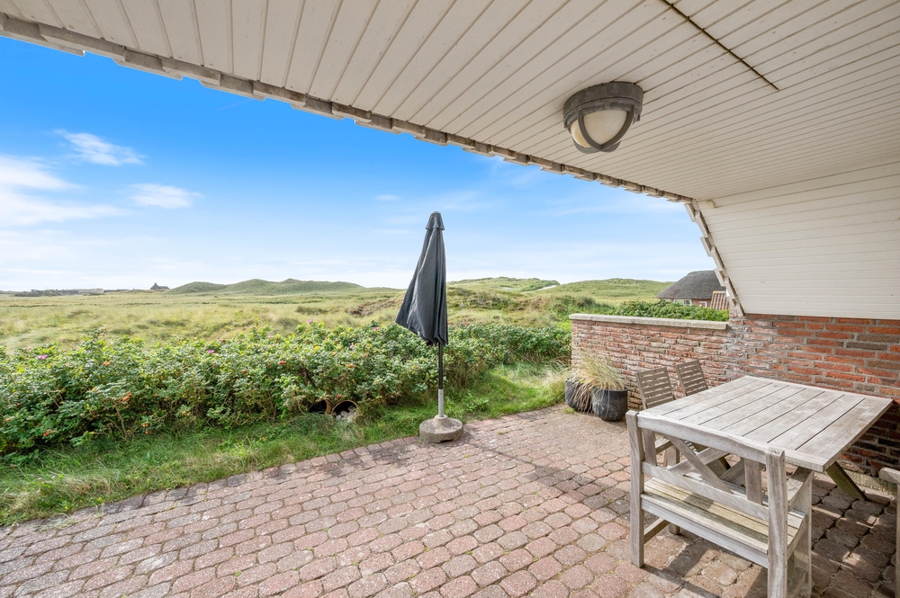 Både fra stuen og især fra den sydvendte terrasse er der en smuk og fantastisk panoramaudsigt over det smukke klitlandskab mod syd og mod vest. Her er det marehalmsklædte klitområde helt fredet, hvilket er et smukt syn og så er det samtidigt fredfyldt. At vågne op med åbent vindue i soveværelset er ubeskriveligt, bruset fra Vesterhavet høres, og vindens susen i marehalmen og den frisk luft i kombination er en skøn start på en feriedag.