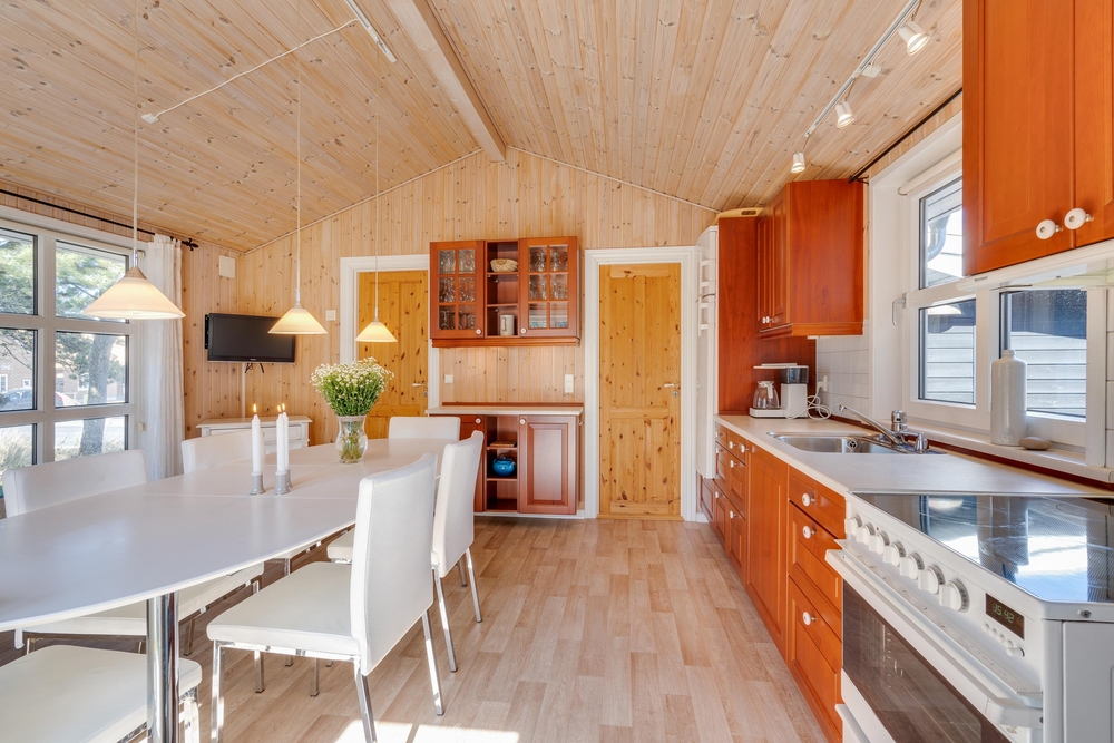 Fra entreen, hvor I kommer ind i huset, kan I gå ud i køkkenalrummet og videre ind i stuen. Her er der plads til gode stunder med dem, du holder af. Brændeovnen giver varme og hyggelig stemning, mens I tager et spil kort. I behøves ikke spille om opvasken, for den klarer husets opvaskemaskine.