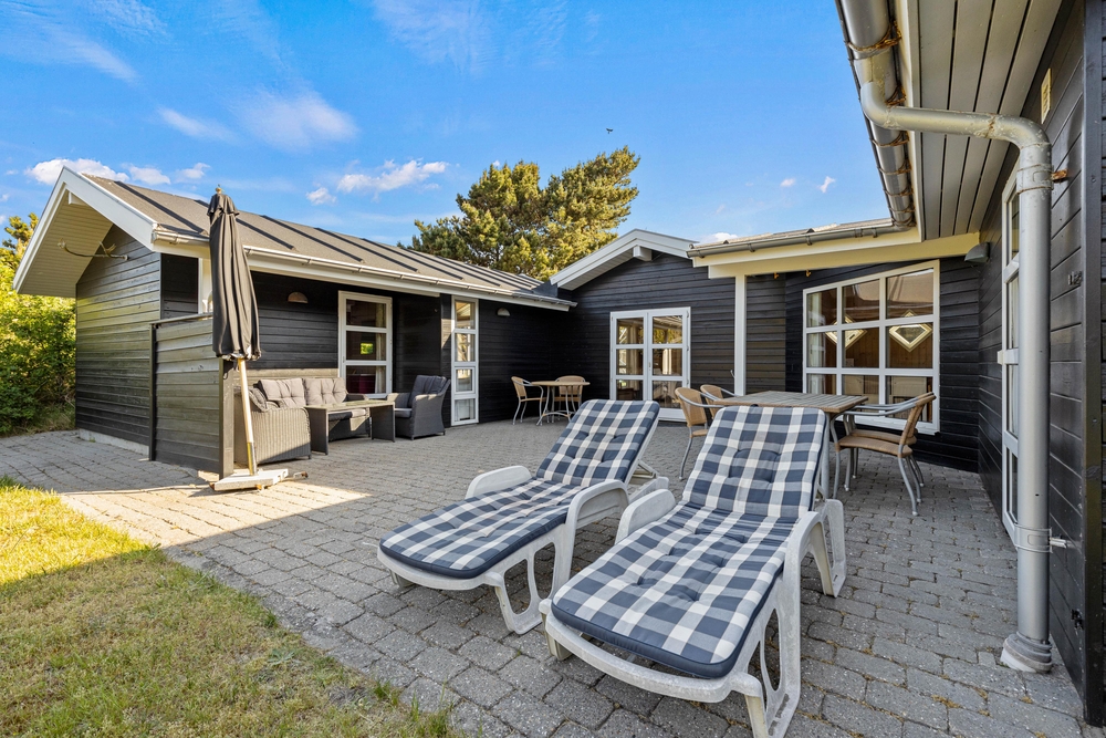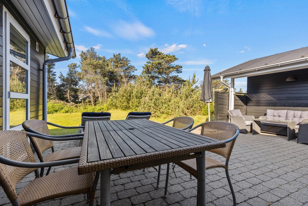 Terrassen befinder sig ved et indhak, hvor I kan sidde afskærmet. Det er også muligt at finde en overdækket plads. Her kan I benytte jer af husets grill, havemøbler, parasol og solvogne.