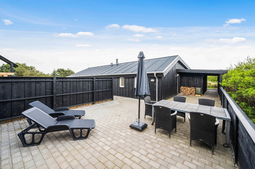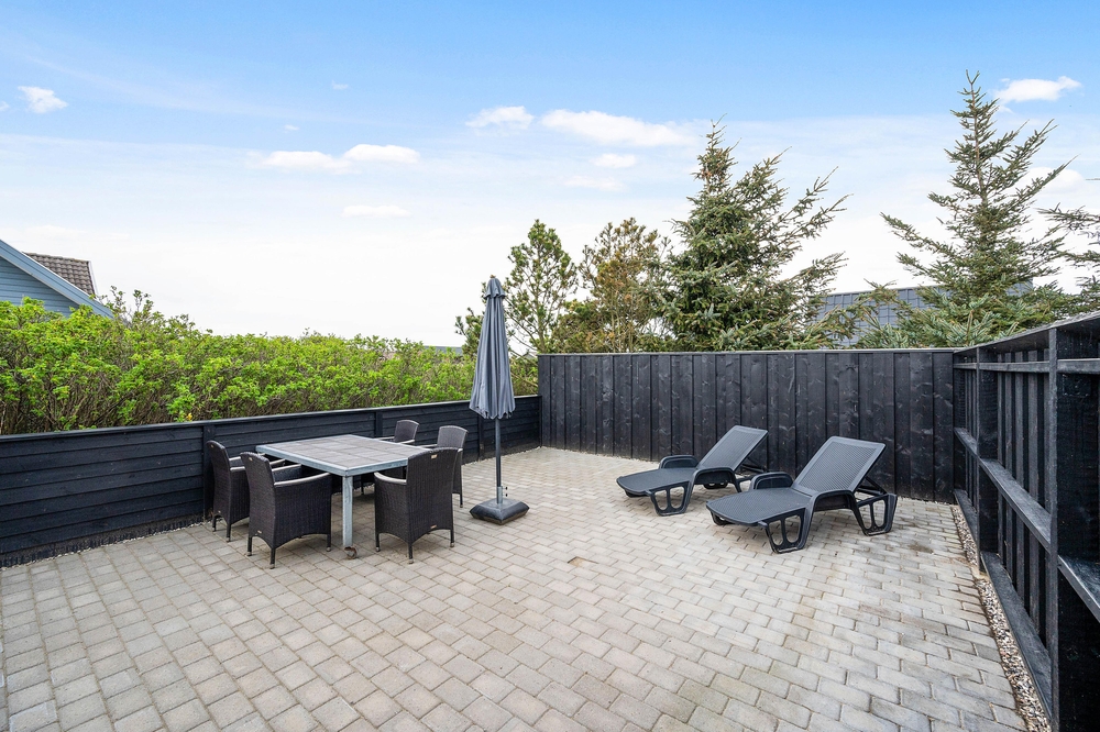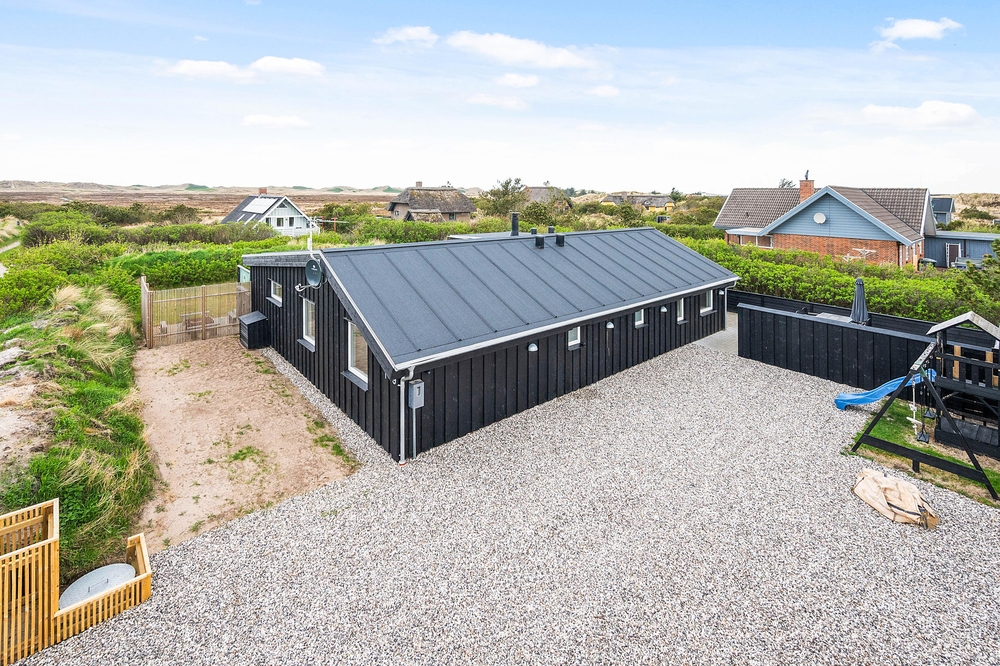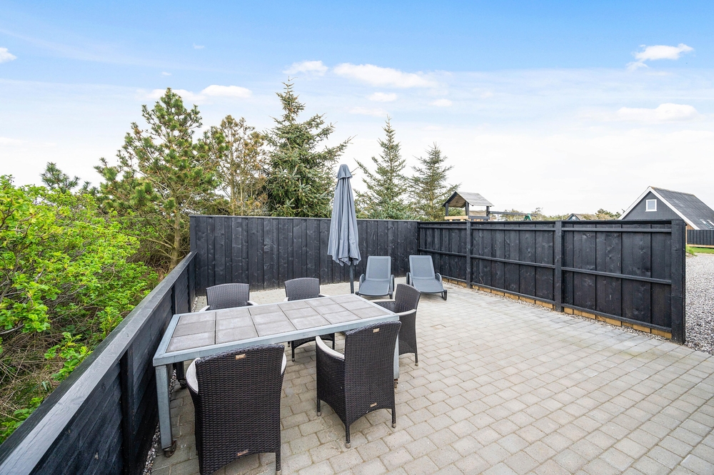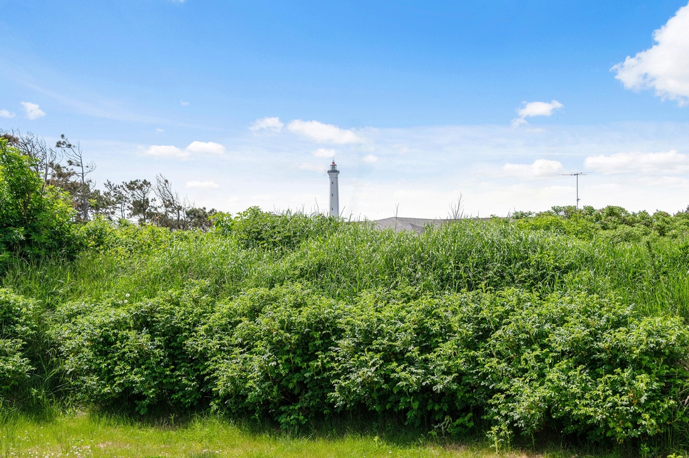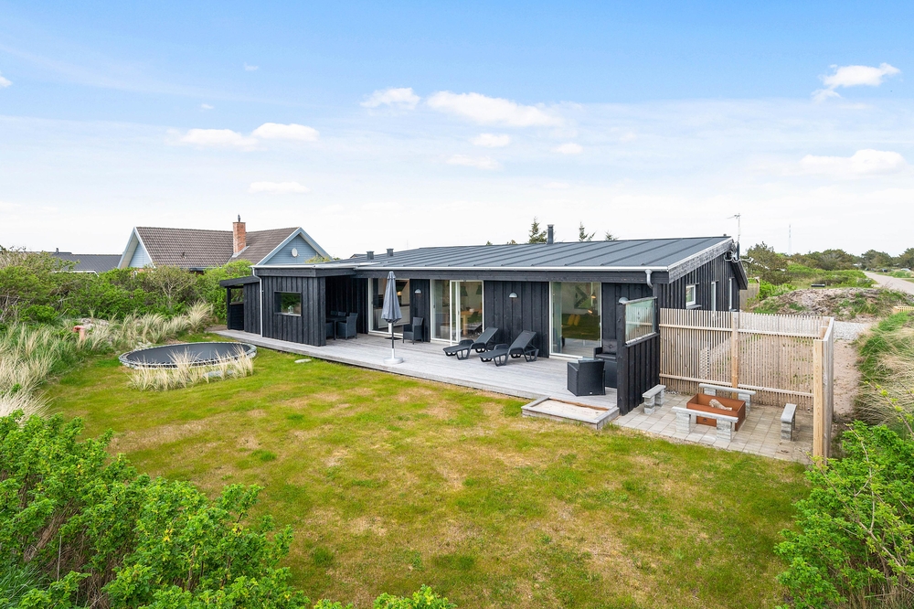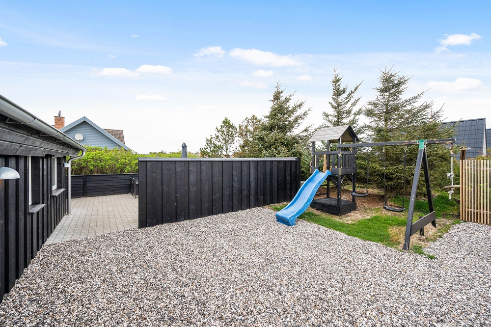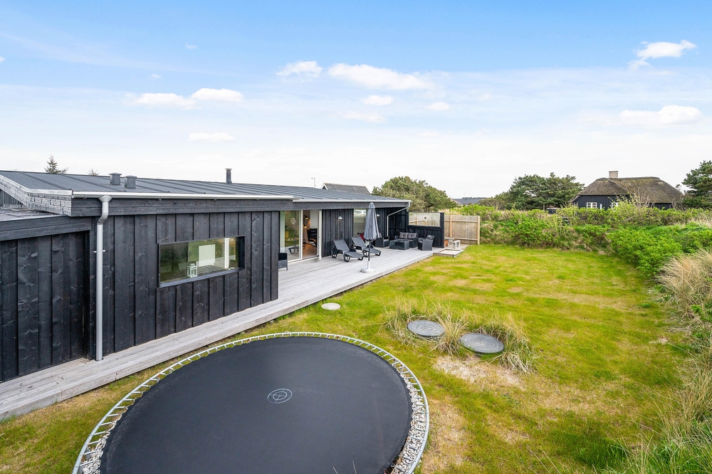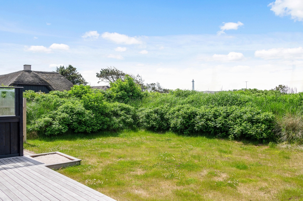Fra den store terrasse, der vender mod vest, kan I gå ud i haven. Her er der både sandkasse og trampolin, som vil være til stor glæde for den yngste del af feriebesætningen. På den anden side af sommerhuset er der desuden endnu en terrasse samt et gyngestativ med rutsjebane. Fra sommerhuset er der en fantastisk udsigt ud over den jyske hede og til Nr. Lyngvig Fyr, som siges at være porten til Vesterhavet.