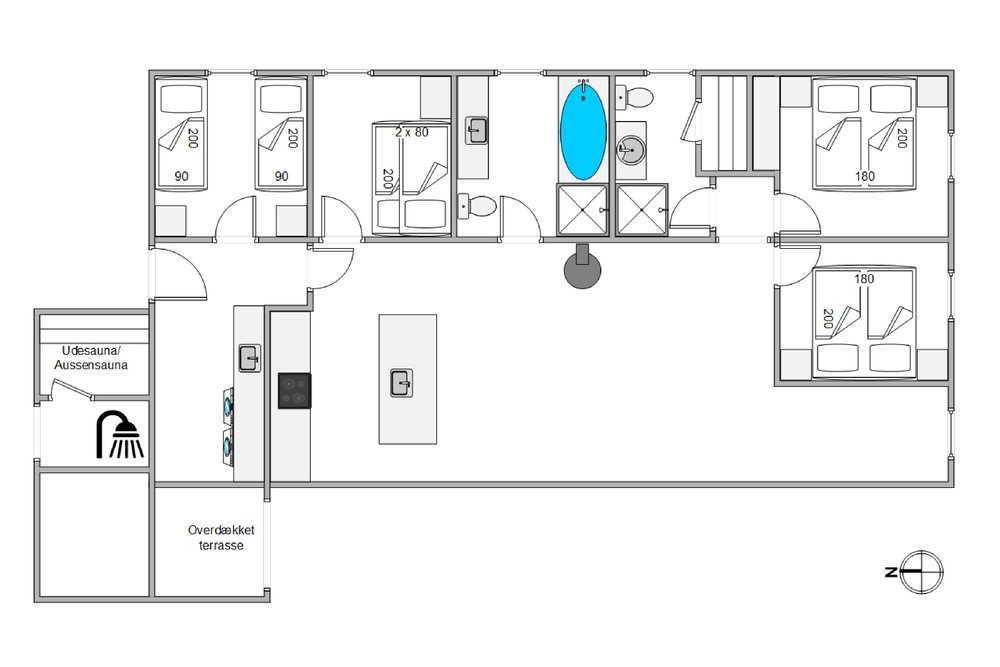 Det er ikke kun indendørs, at feriehuset på Fyrmarken 179 er helt fantastisk; det er udeområdet nemlig også. Her finder I både en udesauna, I kan slappe af i, og en udebruser, hvor I kan skylle sandet af efter en tur ved Vesterhavet, der kun ligger 800 meter væk. I skal dog være opmærksomme på, at udebruseren kun er tilgængelig fra april til november.
