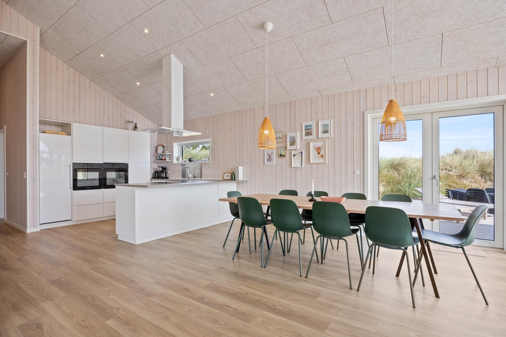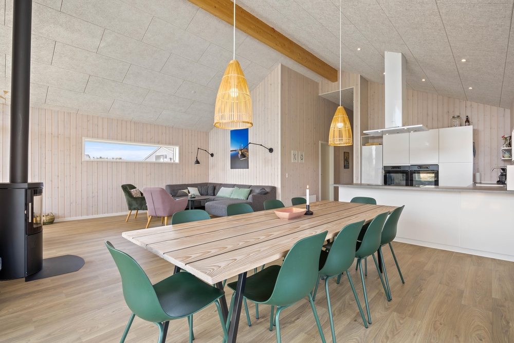 Sommerhusets indretning er lys og moderne og emmer af feriehygge og kvalitetstid med hele familien. Feriehusets samlingspunkt er det dejlige køkken-alrum med plads til godt selskab og mulighed for at nyde varmen fra feriehusets hyggelige brændeovn.