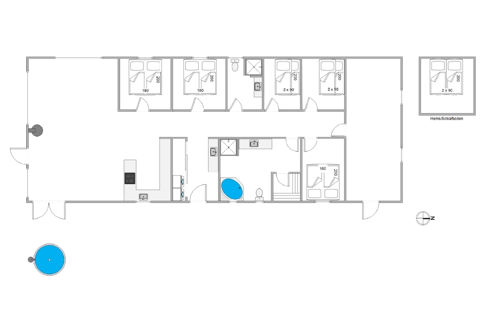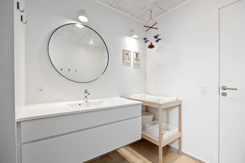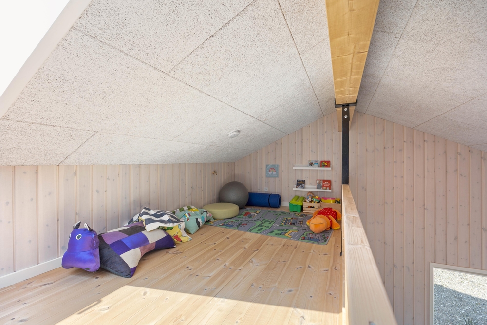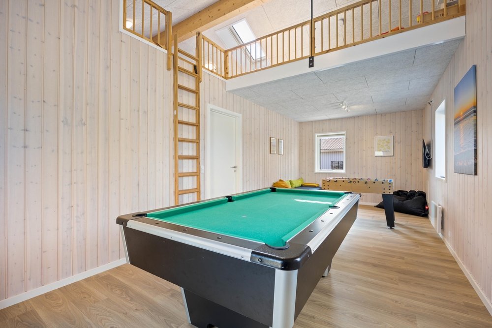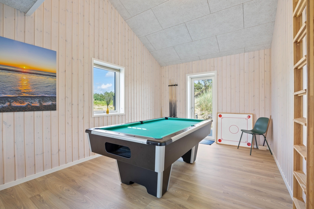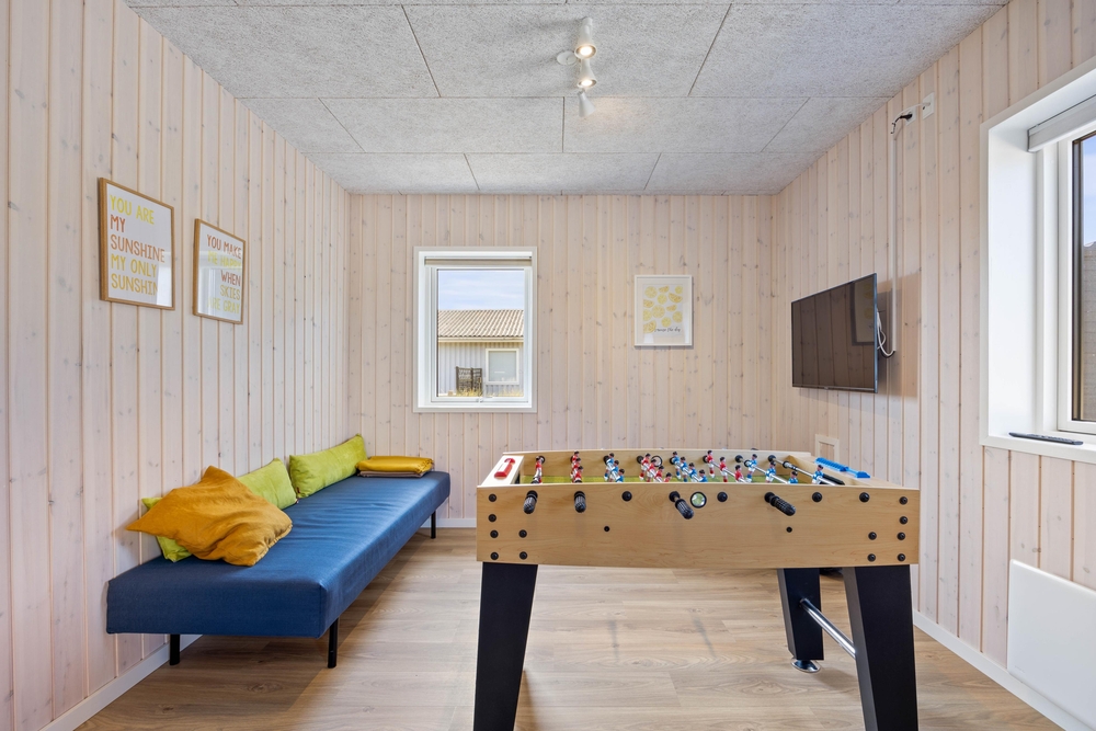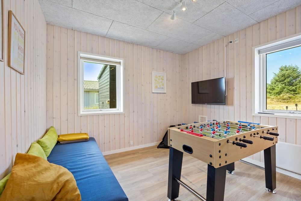 Hvis pulsen skal op, kan hele familien gå en tur i sommerhusets aktivitetsrum, der også har et tv. Her kan I finde en mester i bordfodbold eller i et spil pool. Efter en dag i aktivitetsrummet, eller en gåtur i den skønne vestjyske natur, inviterer sommerhuset til afslapning i saunaen eller det indendørs spabad.