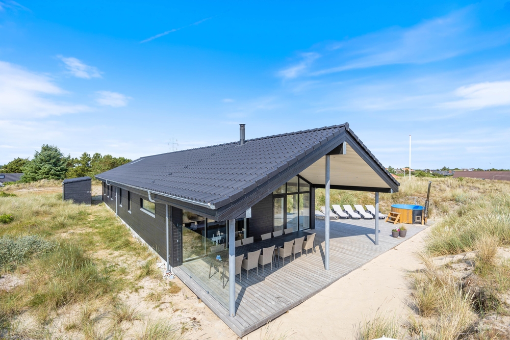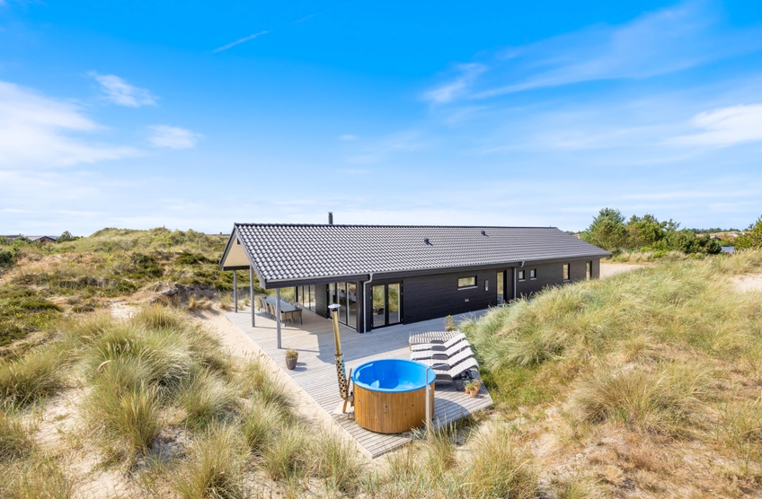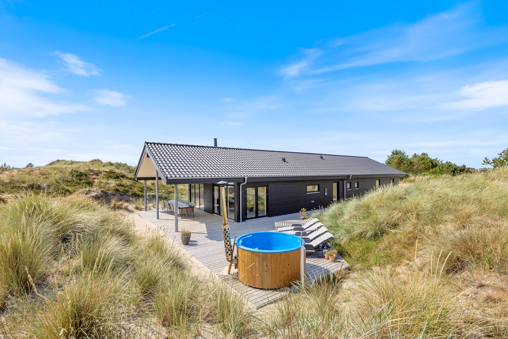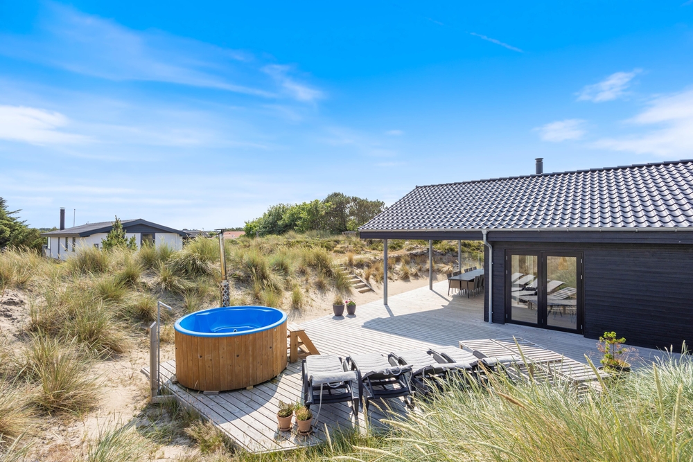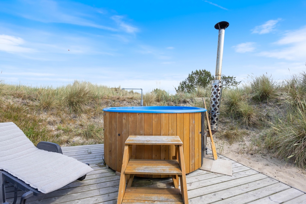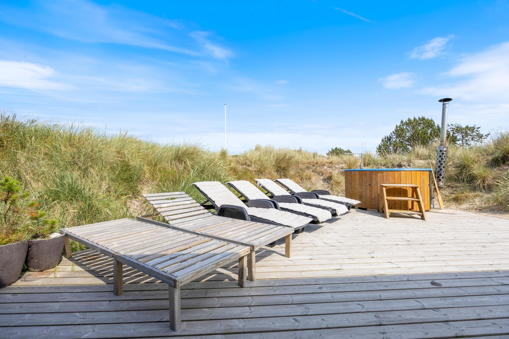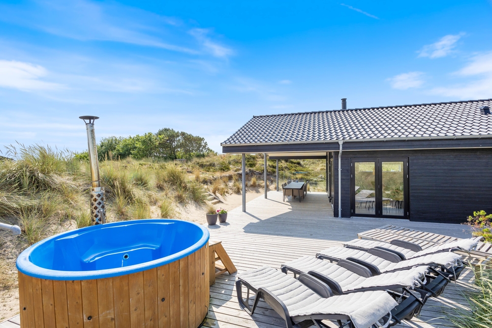 Efter en svømmetur i det brusende Vesterhav har I mulighed for at varme jer i feriehusets lækre vildmarksbad. Den store terrasse er udstyret med liggestole og grill, så I både kan nyde solens stråler og hygge jer med god mad og godt selskab udendørs. I forlængelse af terrassen, er der til feriehuset et stort område med det fineste strandsand, hvor børnene har rig mulighed for flere timers leg.