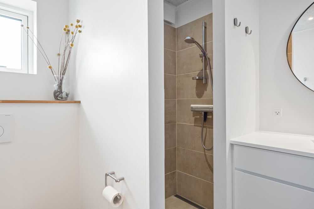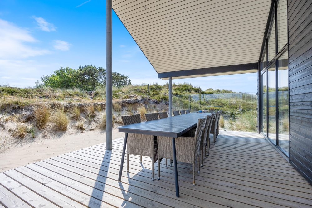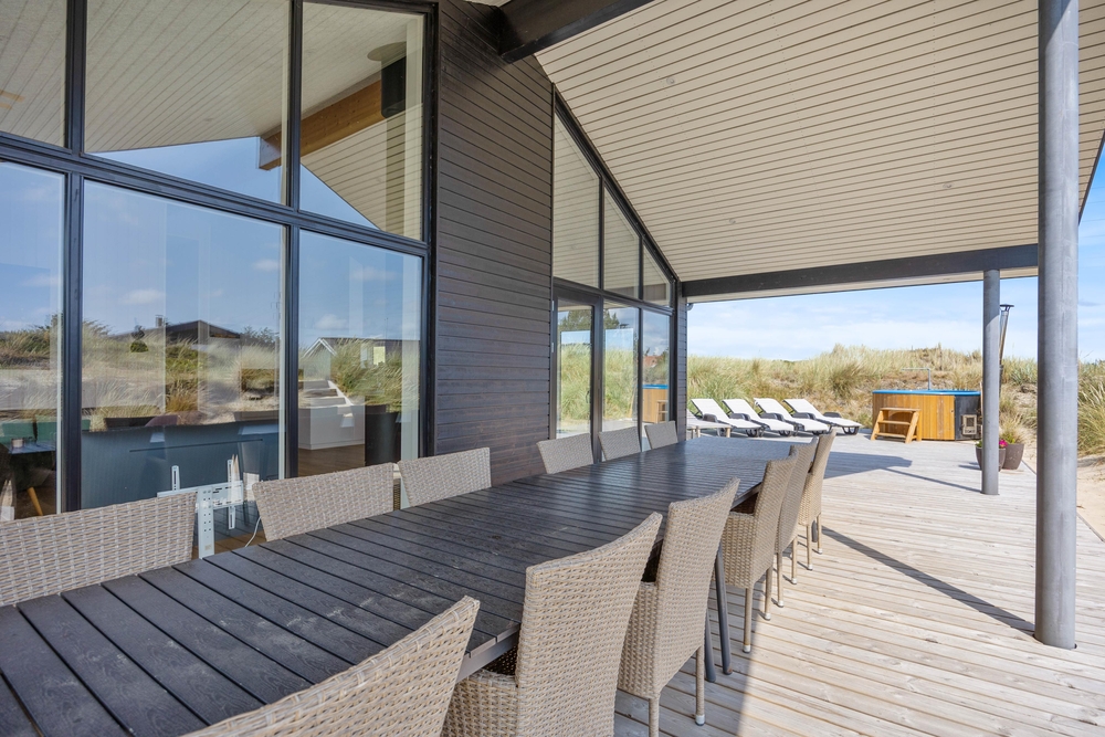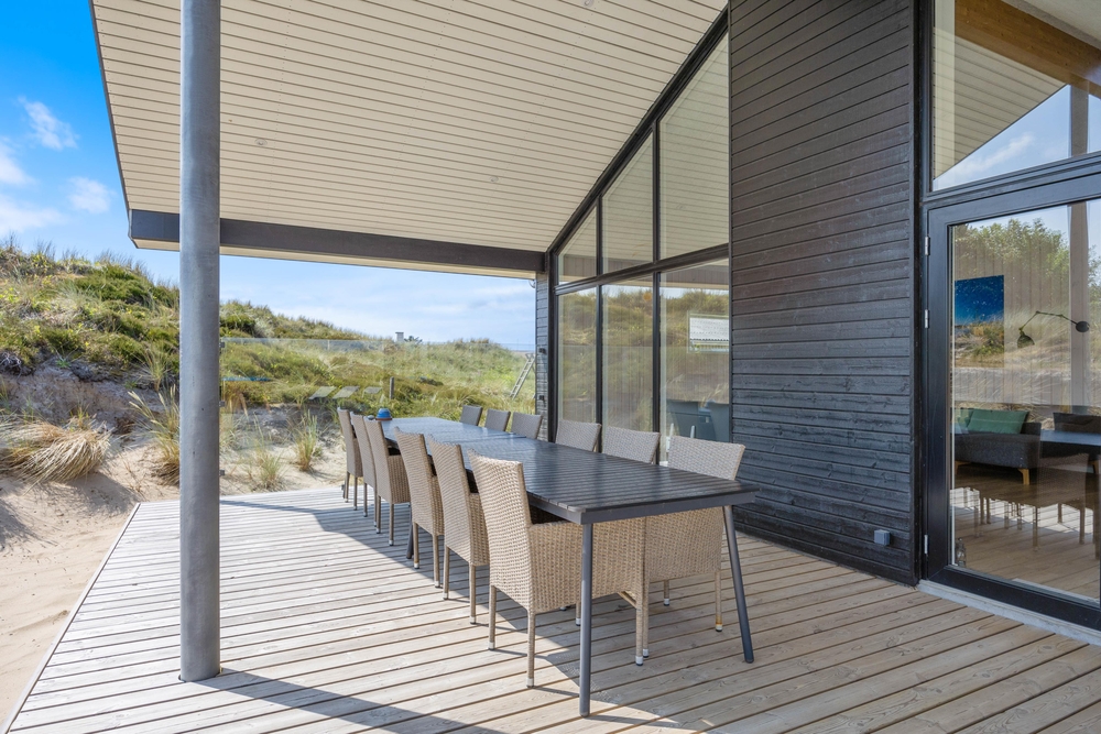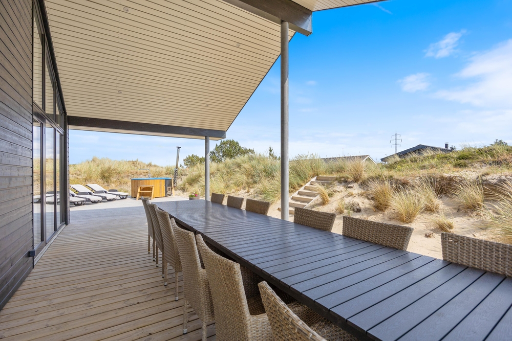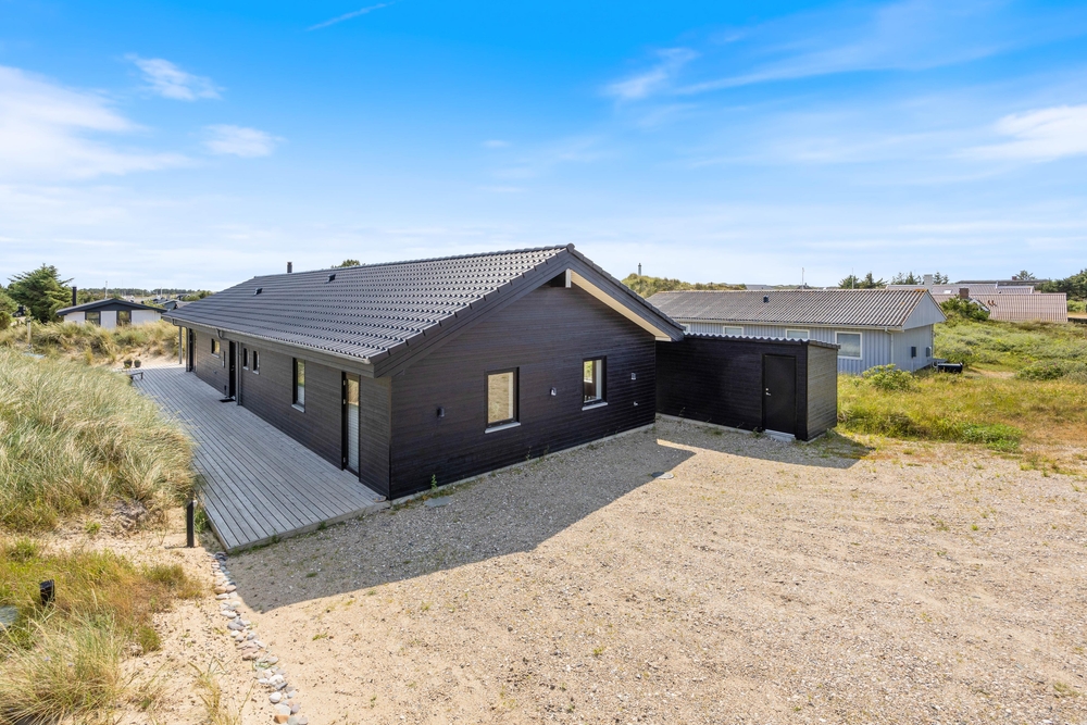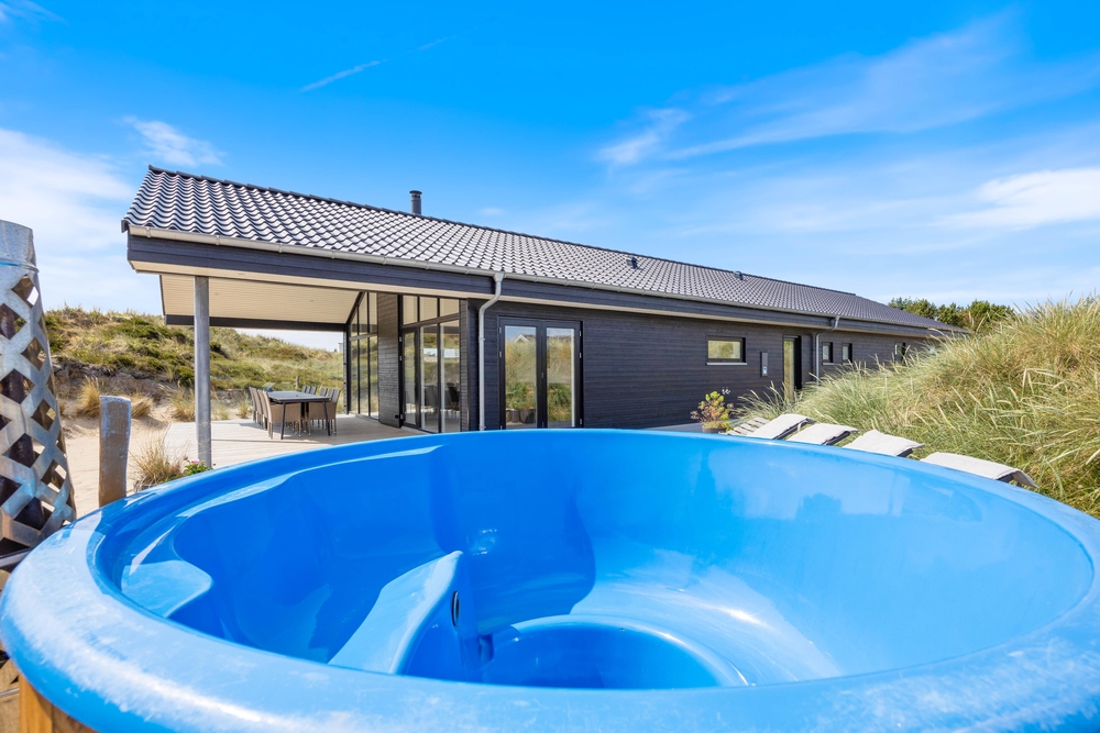 Efter en svømmetur i det brusende Vesterhav har I mulighed for at varme jer i feriehusets lækre vildmarksbad. Den store terrasse er udstyret med liggestole og grill, så I både kan nyde solens stråler og hygge jer med god mad og godt selskab udendørs. I forlængelse af terrassen, er der til feriehuset et stort område med det fineste strandsand, hvor børnene har rig mulighed for flere timers leg.