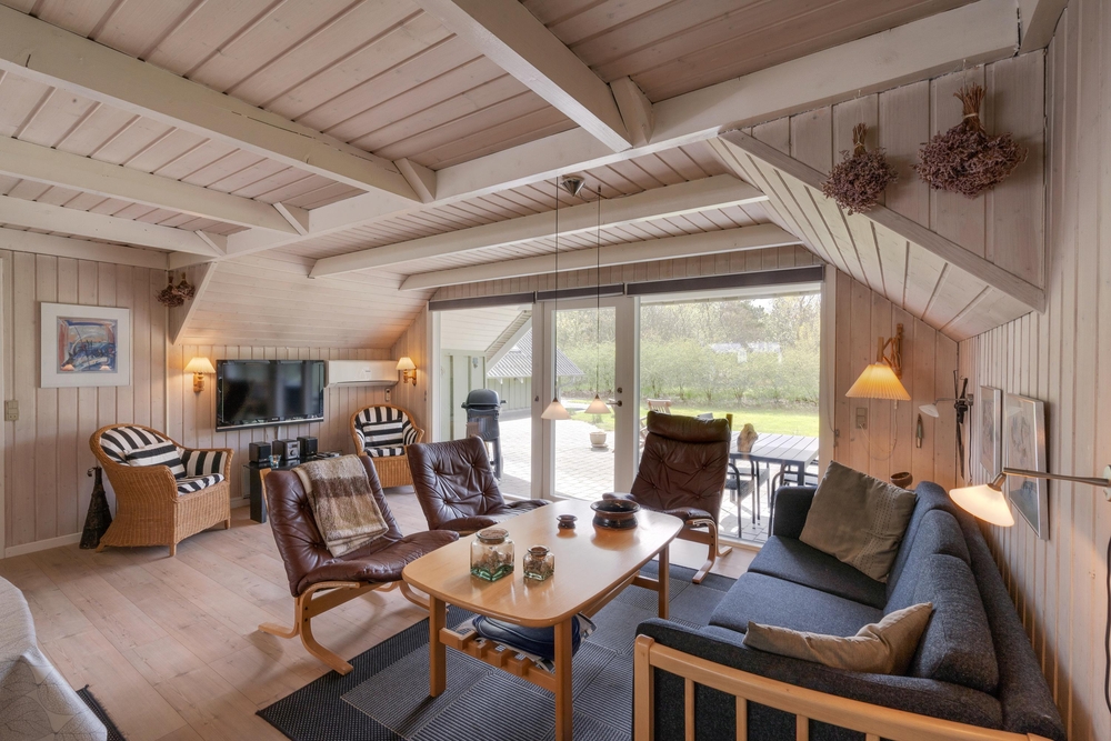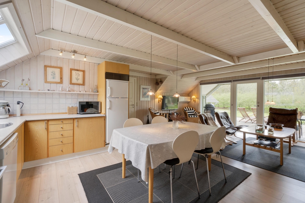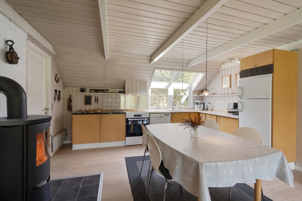 Husets hjerte er den lyse og åbne spisestue, der ligger i forbindelse med køkkenet, og her er der lagt op til masser af timer med samvær og hygge. I sofahjørnet kan I sætte jer godt til rette med en god bog og et glas vin, og den knitrende brændeovn i baggrunden vil sørge for både varme og ægte feriestemning.