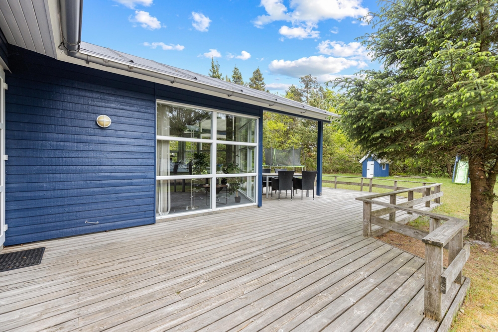Haven er en herlig legeplads til børnene med både gynger, sandkasse, legehus og trampolin fra april til oktober. Her kan de hurtigt få tiden til at gå, mens I laver aftensmad i køkkenet eller udenfor på grillen på de lune sommeraftener.