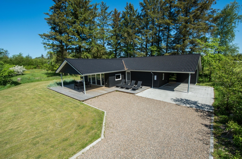 Den overdækkede terrasse er skøn i næsten alt slags vejr, og er udstyret med gode havemøbler og naturligvis med gasgrill, som kan være behjælpelige med at lave en lækker middag. Plænegrunden, der omgiver sommerhuset, indbyder til leg og boldspil og til de mindste er der tilmed en gynge. På en regnvejrsdag kan du parkere bilen i sommerhusets carport og komme tørskoet ind med bagage eller indkøb.