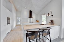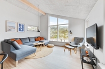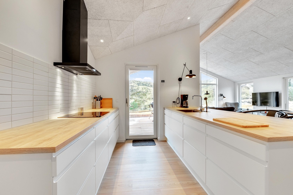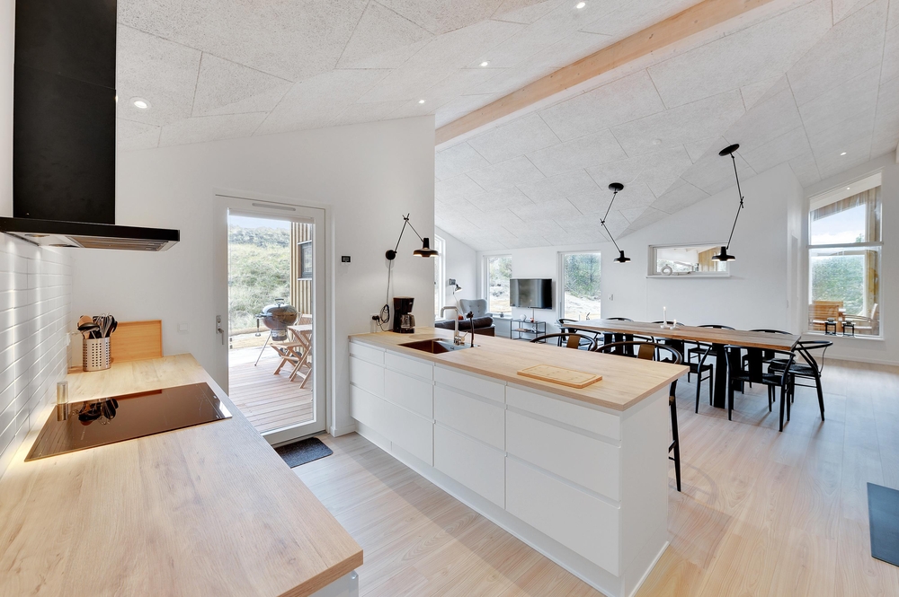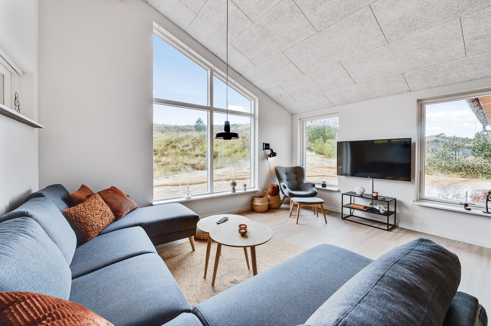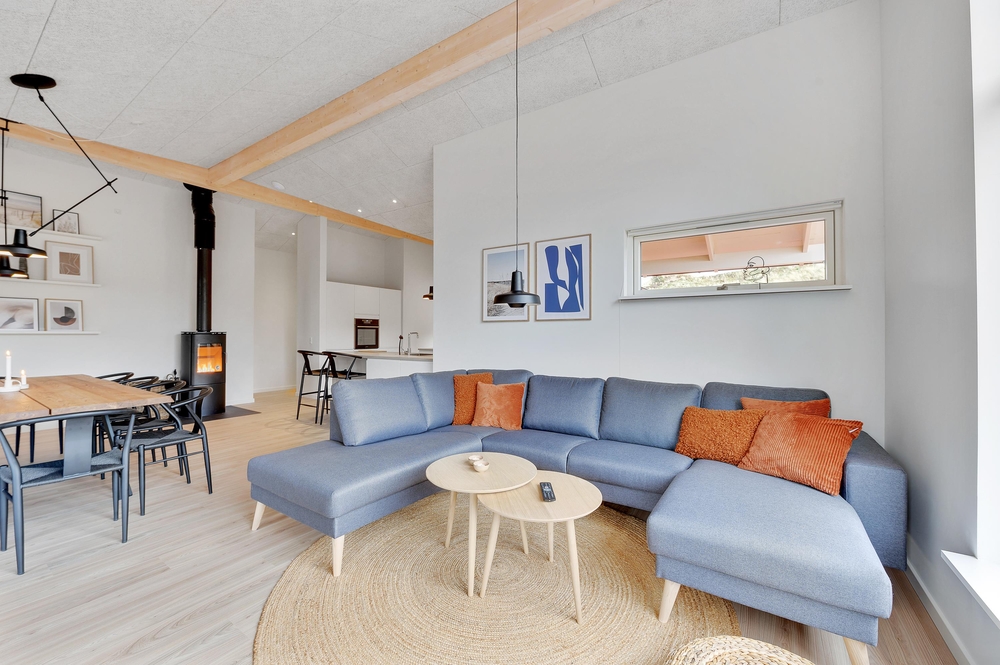 Opholdsrummet med åben forbindelse til køkkenet er feriehusets hjerte, og her kan I tilbringe mange hyggelige stunder i godt selskab, mens brændeovnen sender ferieatmosfæren helt i top.