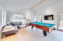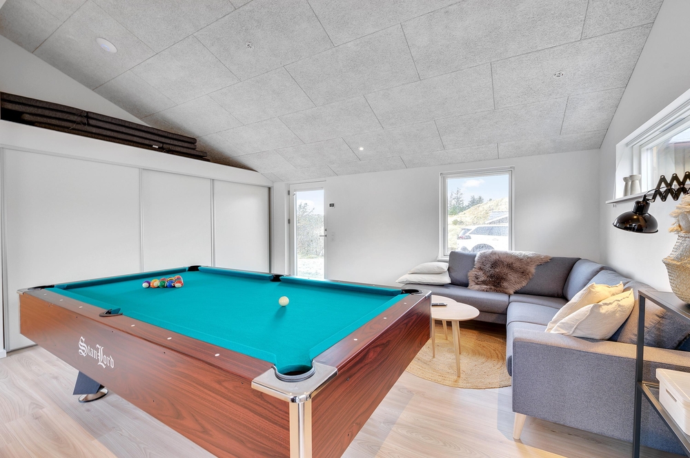 Feriehusets femstjernede vurdering er ikke til at tage fejl af. Den gennemførte indretning indeholder blandt andet 2 badeværelser, det ene med spabad og sauna, hvor de wellnessglade gæster vil finde sig godt til rette. Udover er der et stort aktivitetsrum med billard og bordtennis for dem, der godt kan lide at konkurrere med og mod hinanden.