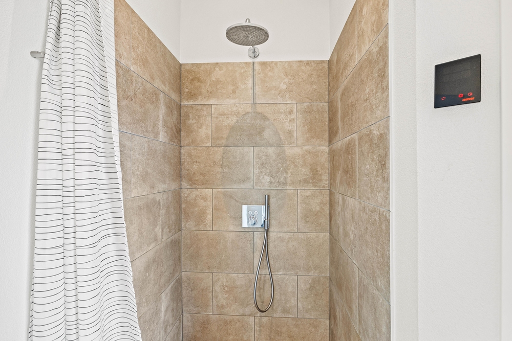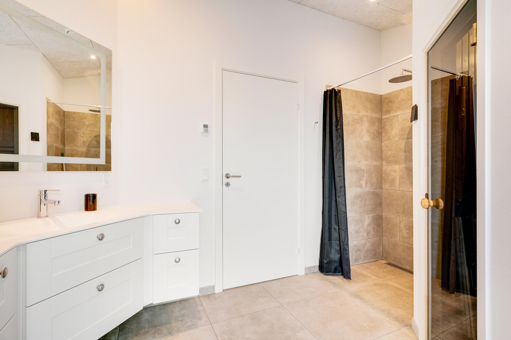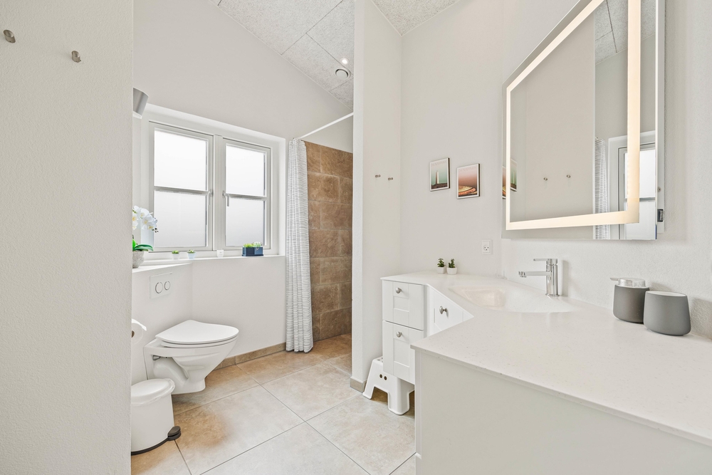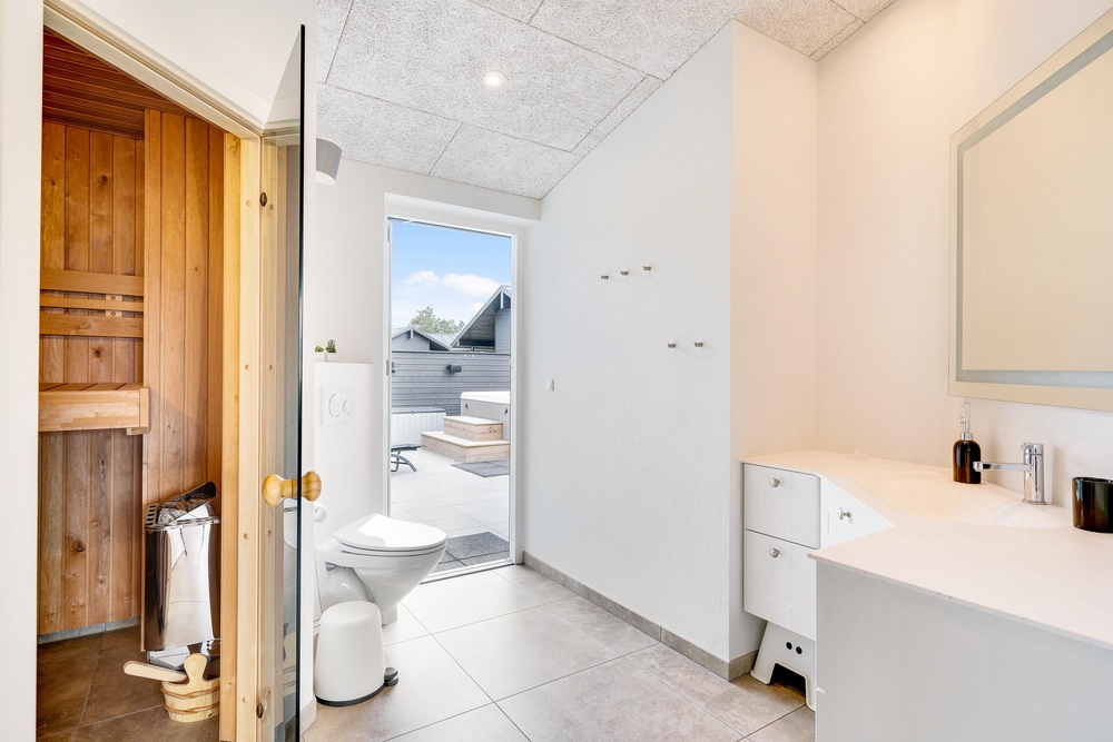 Huset er praktisk indrettet med 2 gode badeværelser, og på det ene af badeværelserne er der adgang til husets sauna. Her kan I rigtig få lov til at slappe af og lade batterierne op efter en skøn feriedag i den friske luft.