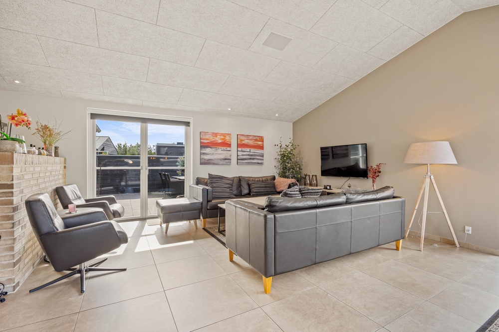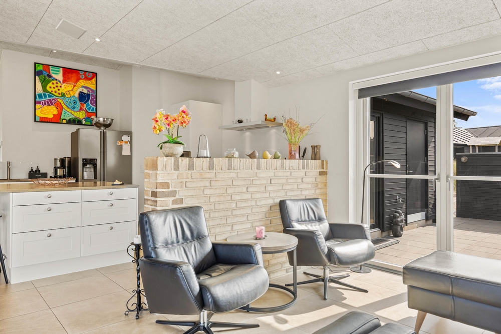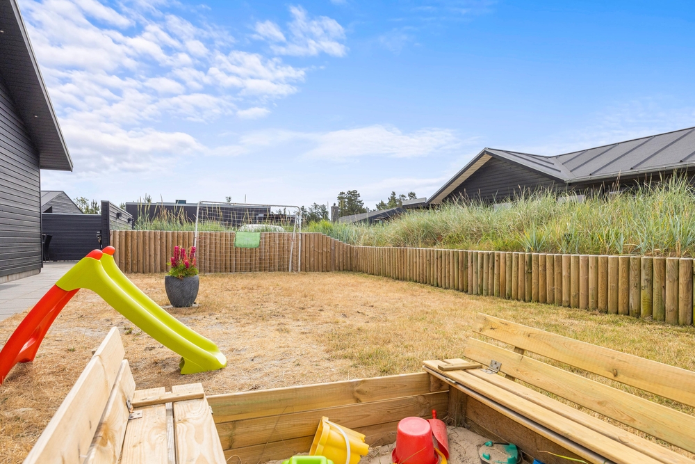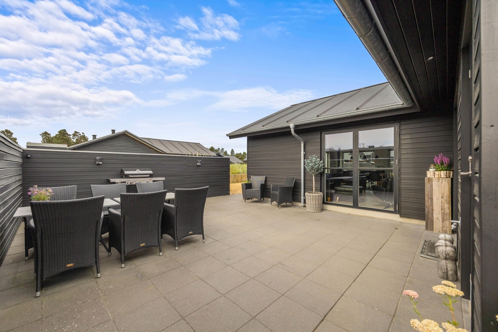 Rundt om huset finder I to gode terrasser mod øst og vest. Mens den ene terrasse er afskærmet, er den anden helt lukket, så I roligt kan lade børnene lege, mens I slapper af i liggestolene eller er i gang med at forberede aftensmaden på grillen.