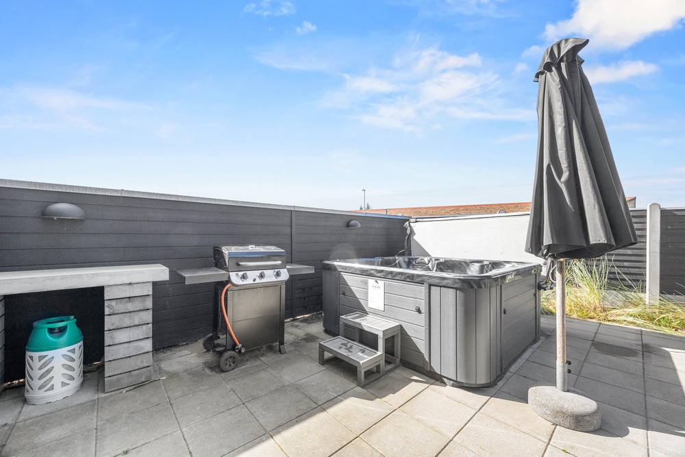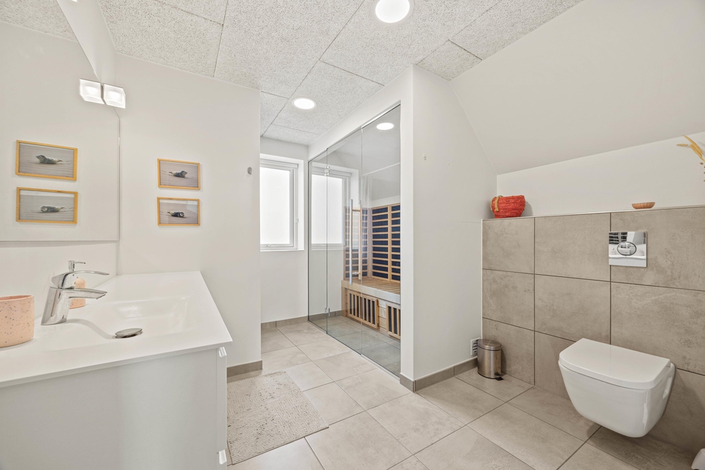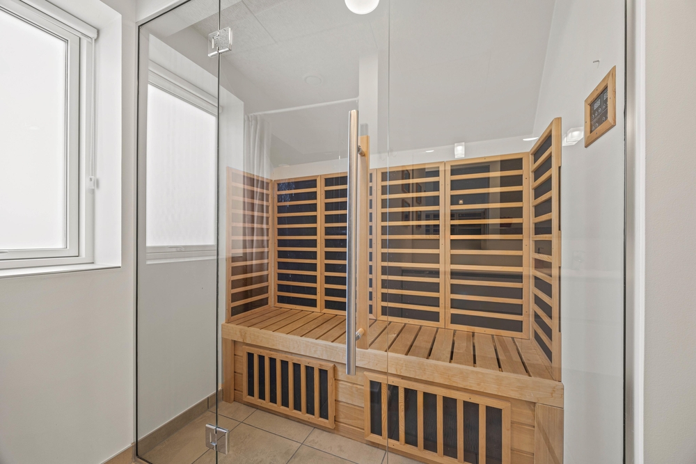 Der er rig mulighed for, at nyde lidt wellness på ferien. Et af feriehusets 3 badeværelser er udstyret med en lækker infrarød sauna, hvor I kan tanke ny energi efter en spadseretur i den friske havluft. Alternativt kan I hoppe en tur i det store, udendørs spabad på terrassen.