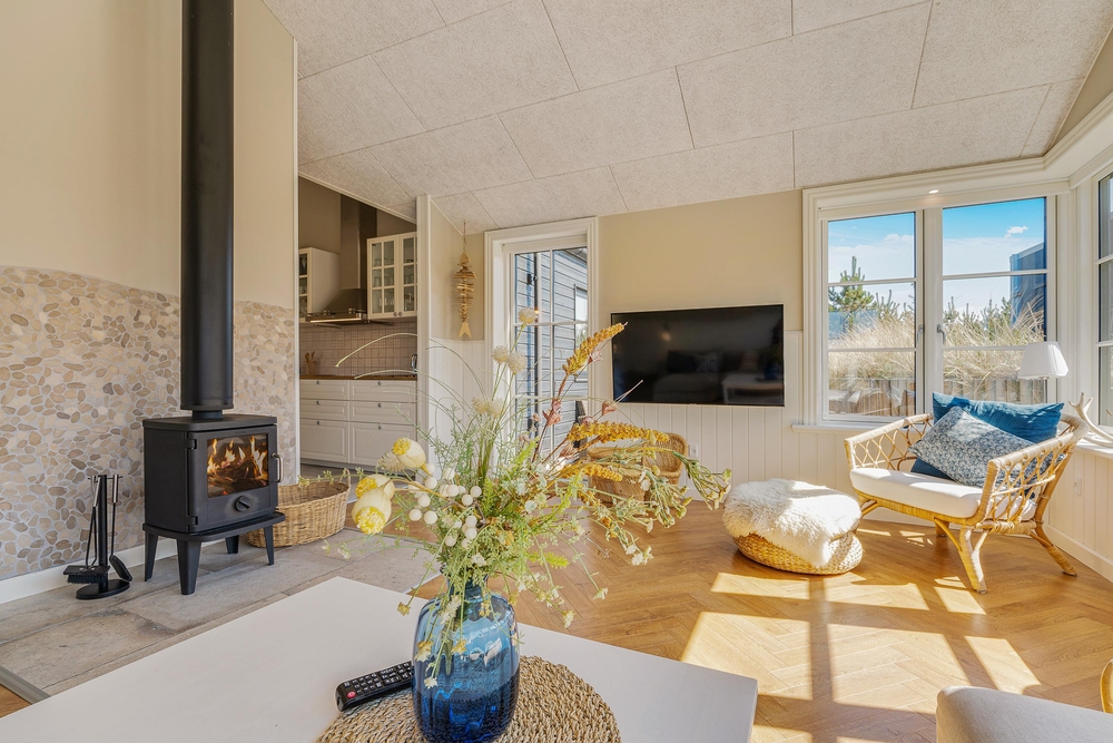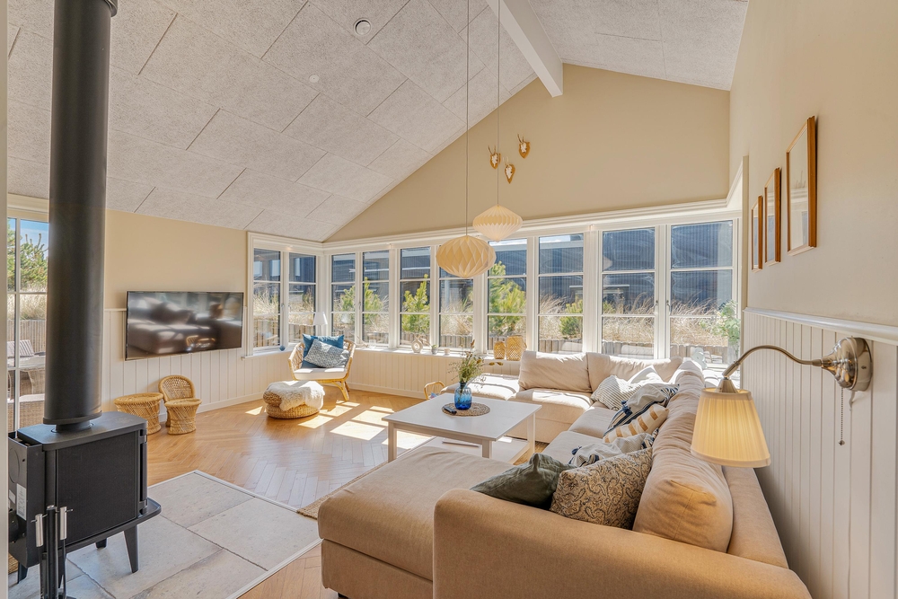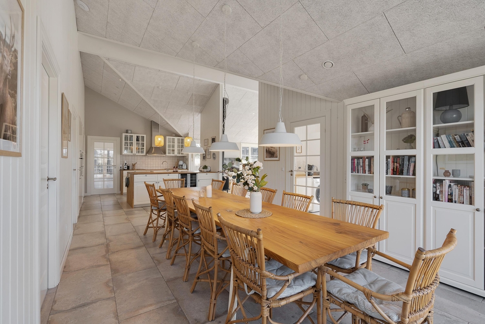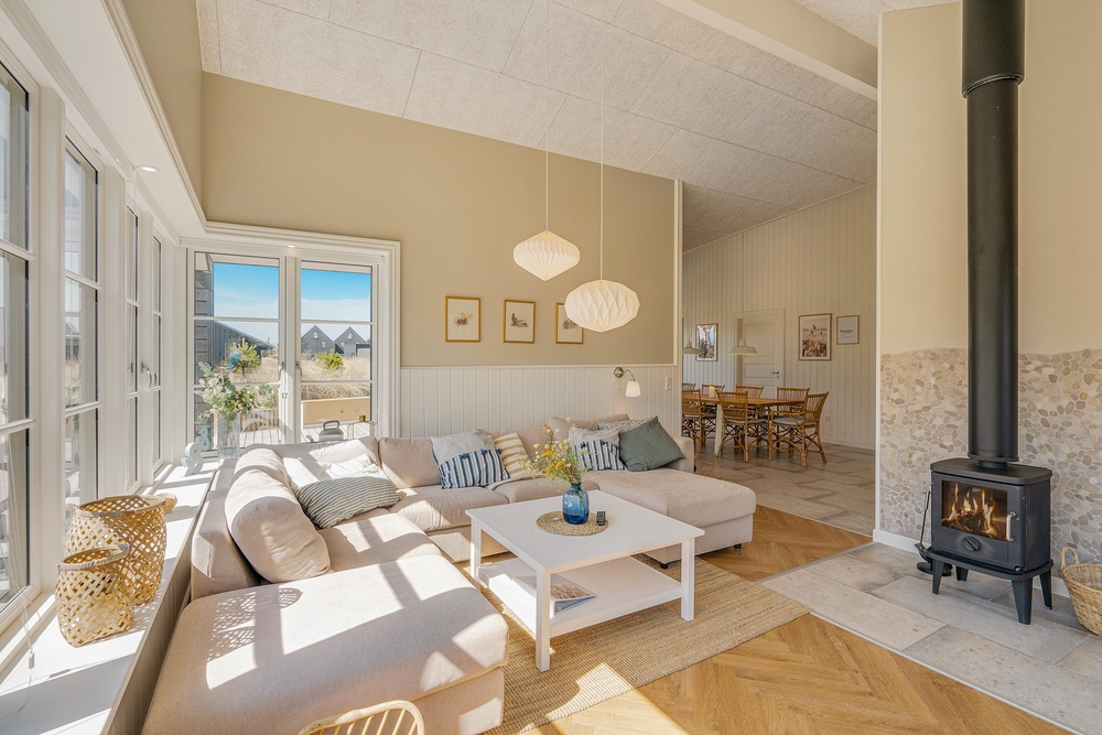 Feriehusets hjerte er uden tvivl det store køkkenalrum. I køkkenet er der rigeligt plads til at samles om madlavningen, mens resten af familien spiller spil ved spisebordet eller slapper af i den komfortable sofa foran brændeovnen. Køkkenet er veludstyret og indeholder både 2 køleskabe, 2 ovne, opvaskemaskine, vinkøler og Nespressomaskine med mælkeskummer.