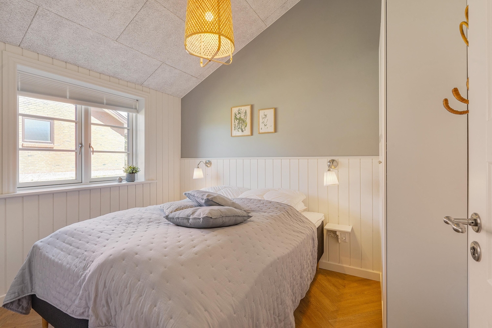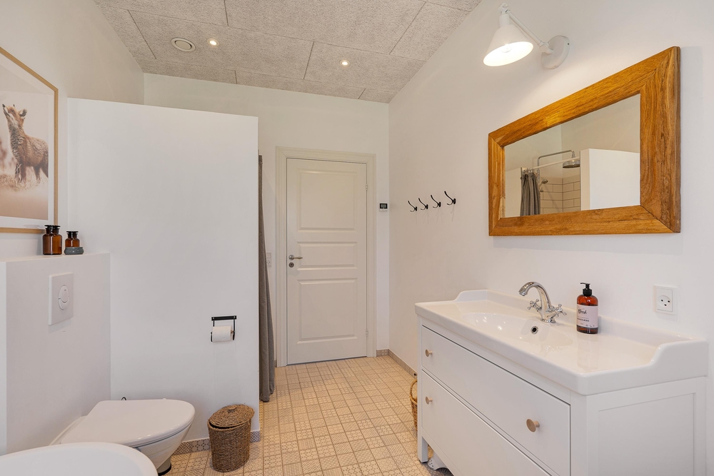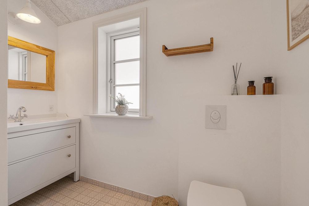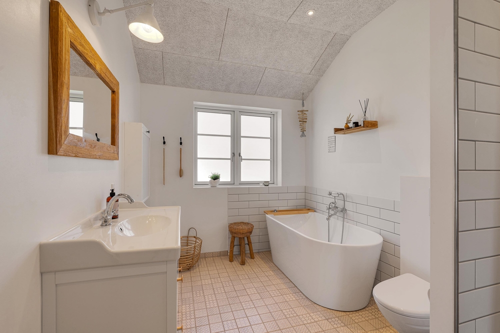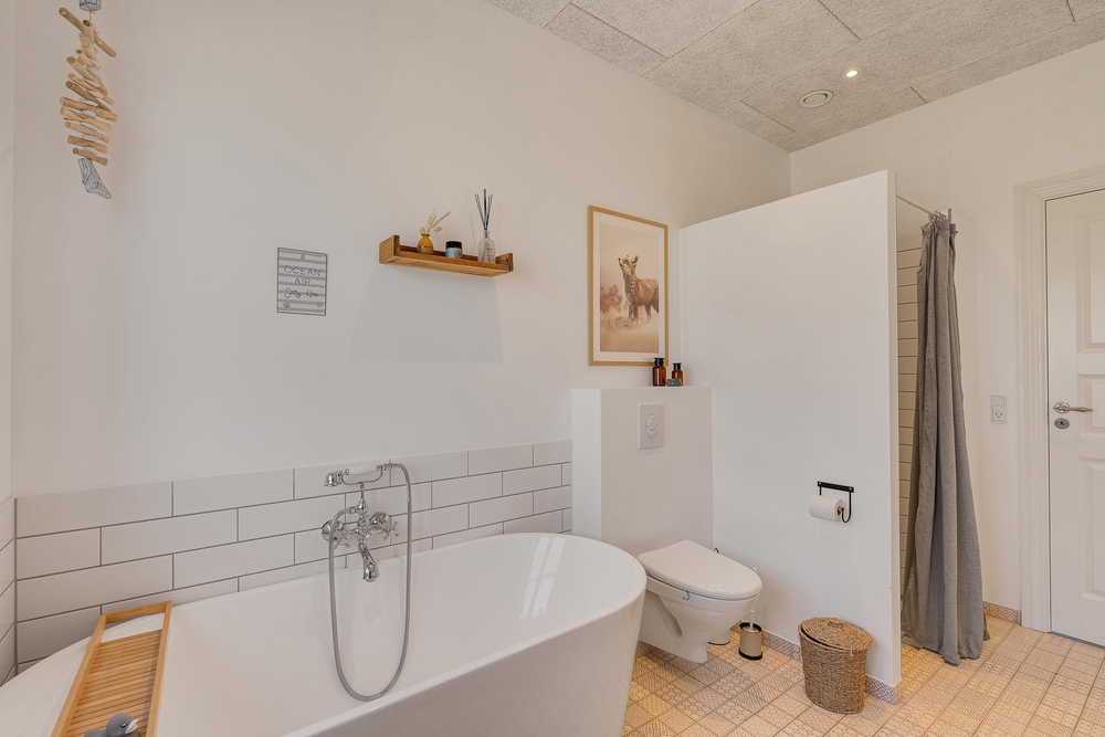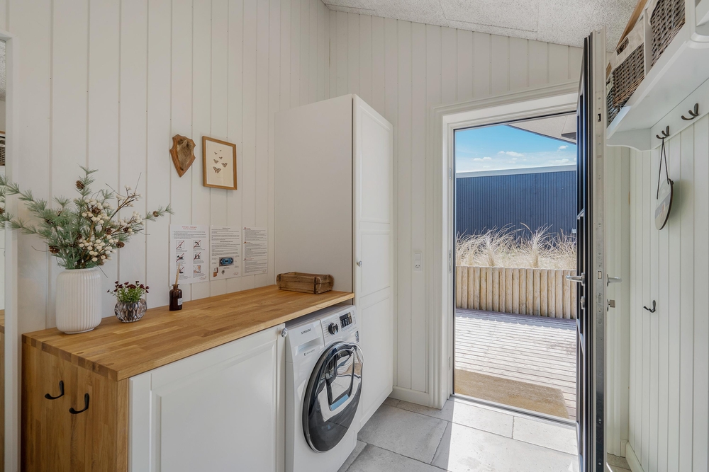 Rent praktisk rummer feriehuset 6 soveværelser med dobbeltsenge og 3 badeværelser ? hvoraf et er med puslebord og badekar, så I til hver en tid slipper for kø om morgenen. Tøjvask er også hurtigt klaret med en kombineret vaskemaskine og tørretumbler. Samtidig er sommerhuset også energibesparende, da der er gulvvarme i alle rum.