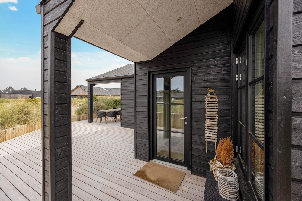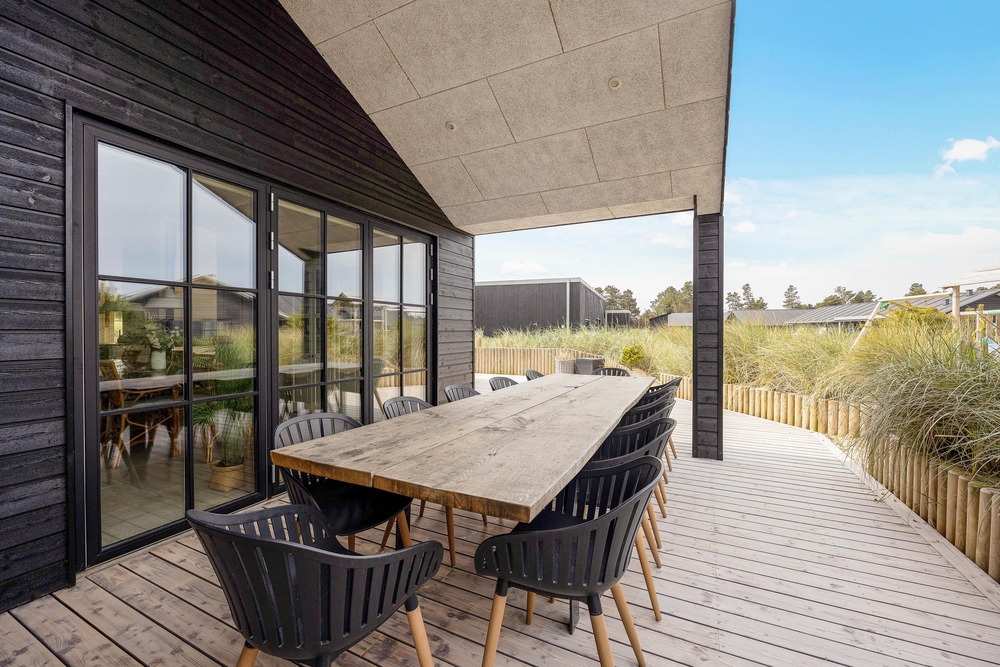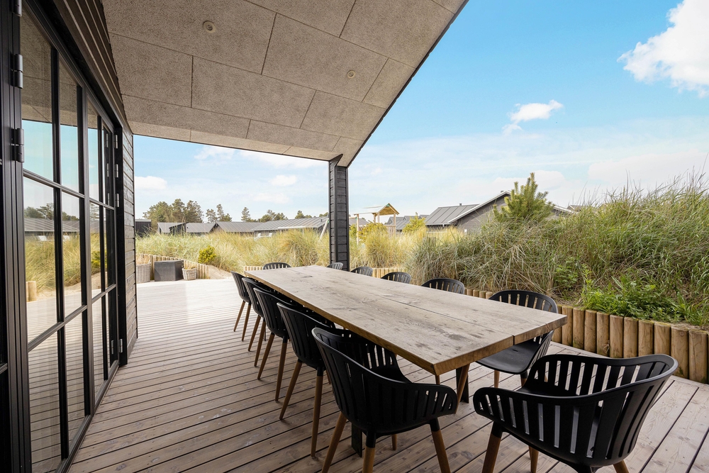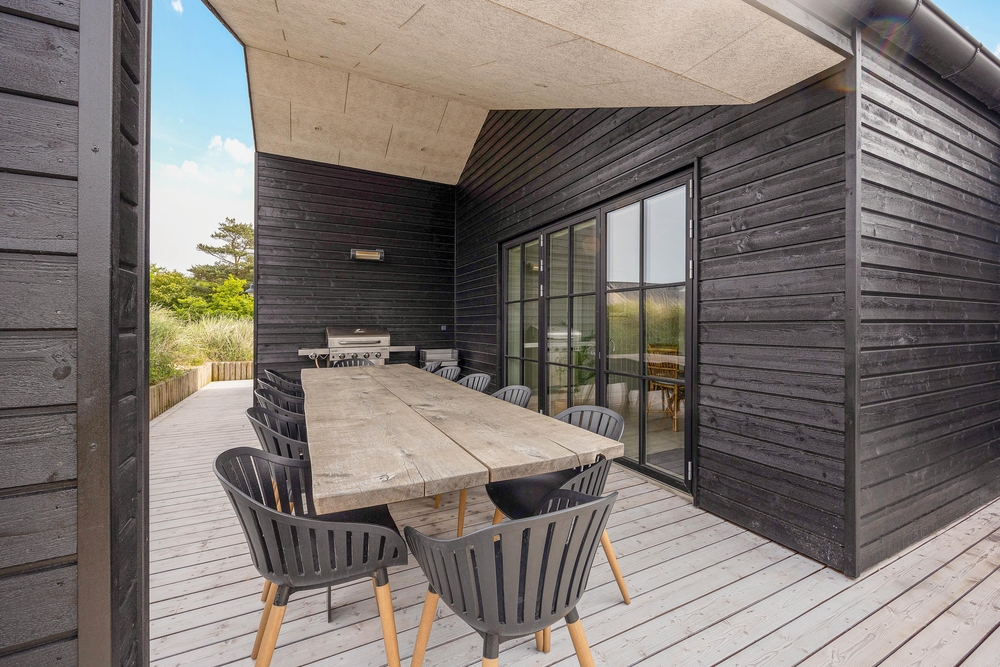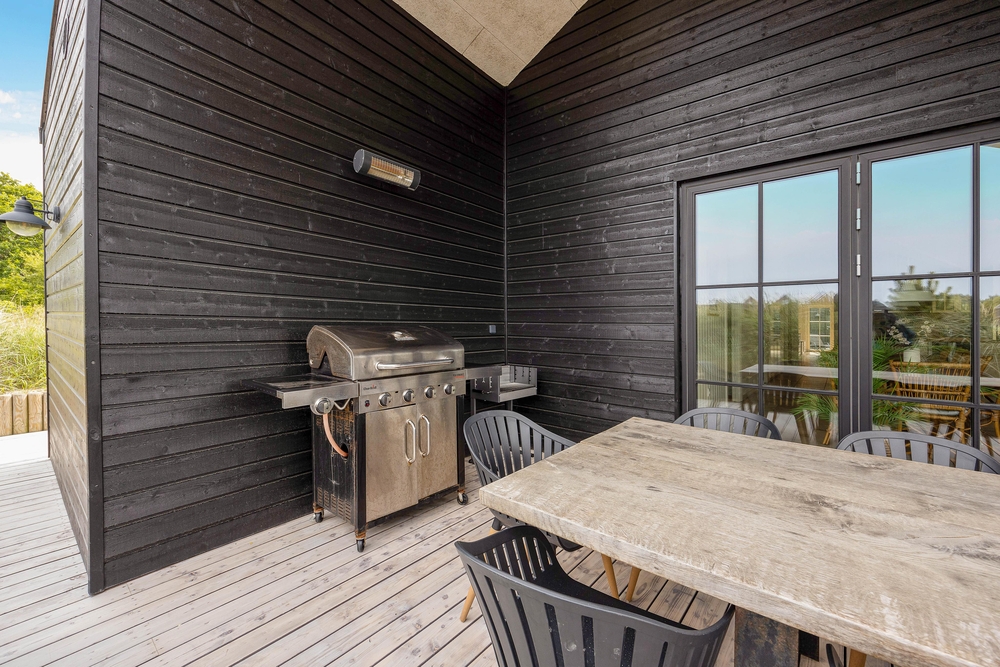 Sommerhuset emmer ikke kun af luksus indenfor; udemiljøet er også helt i top. Her er en tilsvarende stor terrasse, hvor der er flere fine kroge med havemøbler, liggestole og en grill. Dele af terrassen er tilmed overdækket, så I kan runde dagen af med en lækker grillaften i aftensolen på den overdækkede vestvendte terrasse med terrassevarmer.