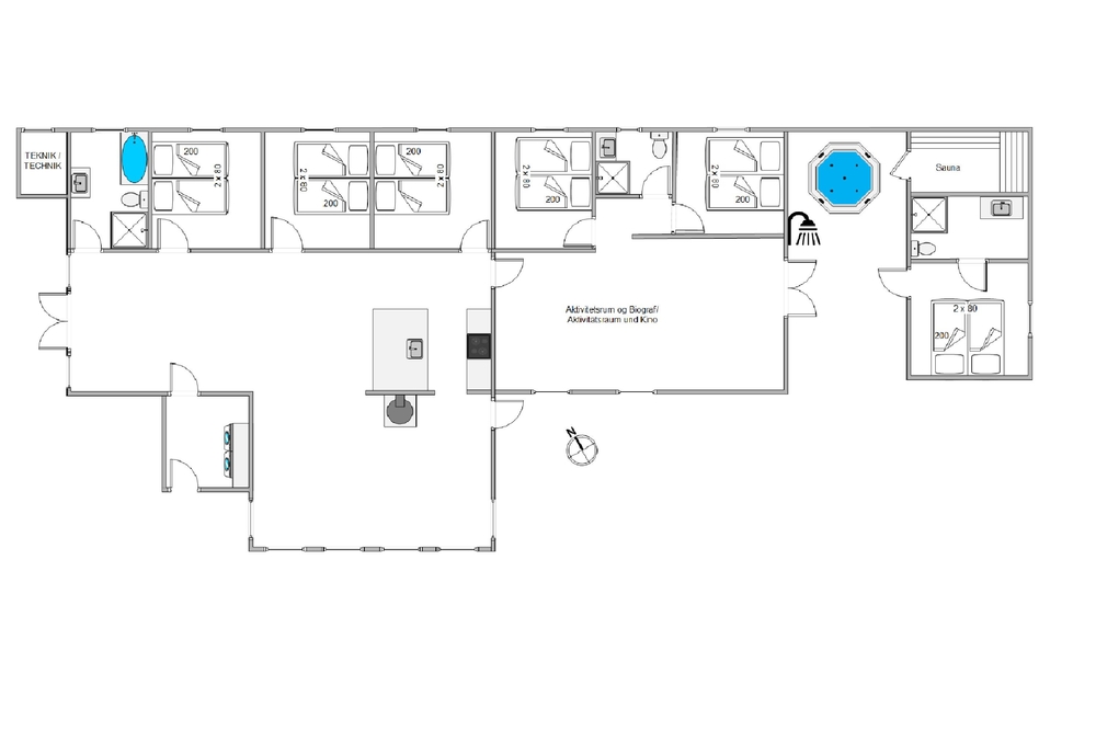 Her får I en absolut perle af et aktivitetshus, der byder på alt, hvad feriehjertet måtte begære. Dette unikke 5-stjernede aktivitetshus er opført i 2020 og har plads til op til 12 personer. Her kan I nyde jeres ferie med familien eller måske samle en flok venner. Feriehuset har 6 soveværelser med dobbeltsenge og hele 3 rummelige badeværelser. Biograf, udesauna og udespa er blot nogle nævneværdige highlights ? og har I elbil, kan I lade direkte ved feriehuset