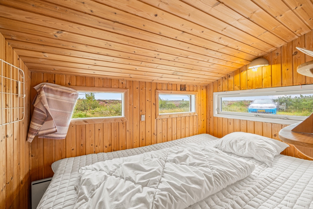Sommerhusets sovepladser er fordelt over 2 skønne soveværelser, med en dobbeltseng i det ene, og 2 enkeltsenge i det andet værelse. Saunaen, hvor I vil kunne varme jer efter en lang gåtur over heden eller ved stranden, befinder sig i sommerhusets badeværelse.