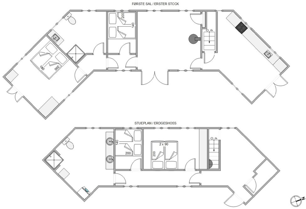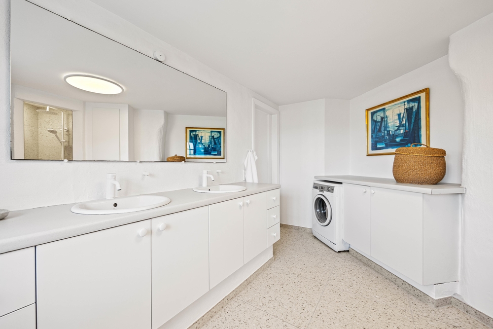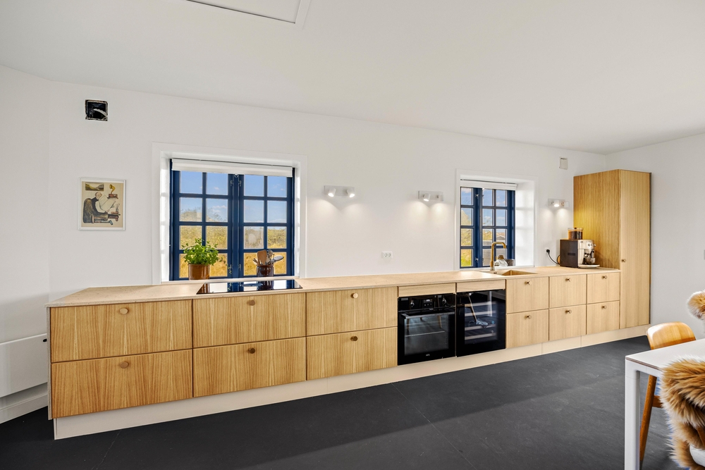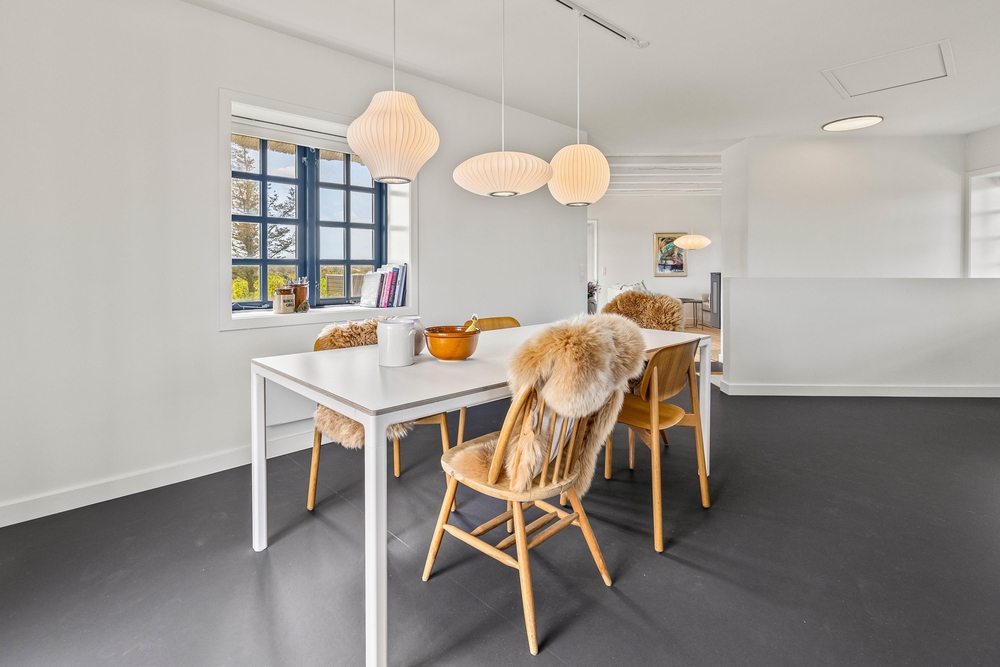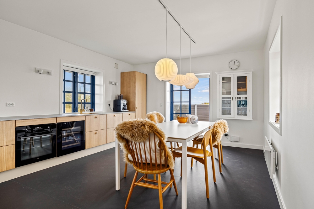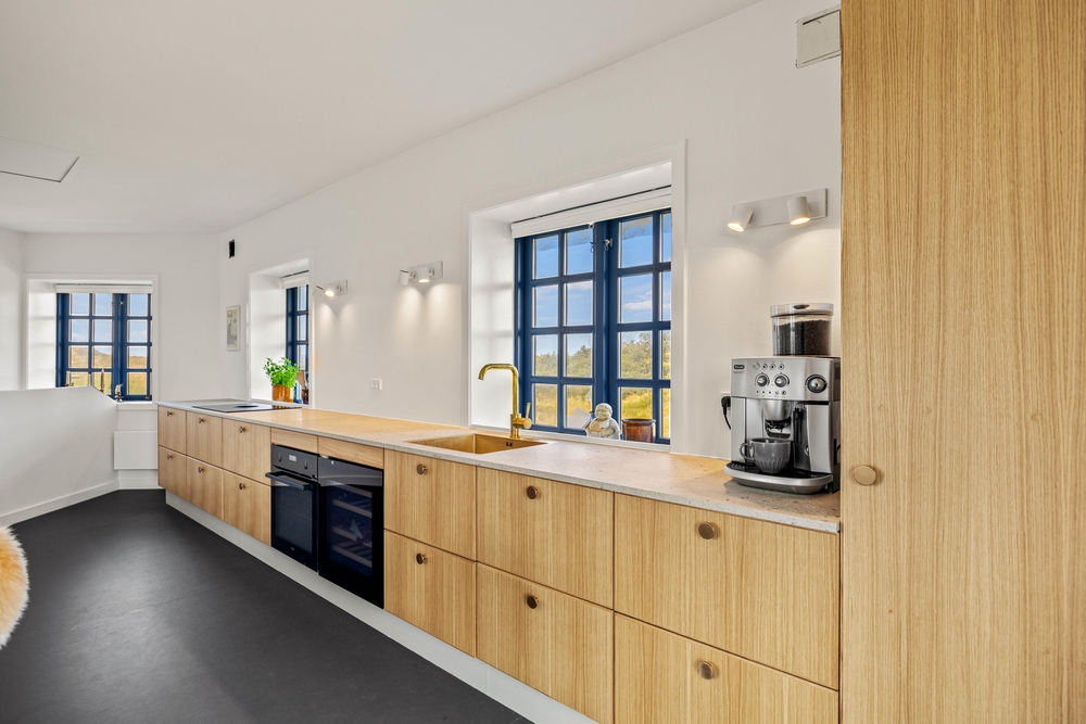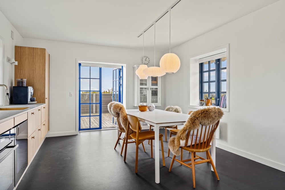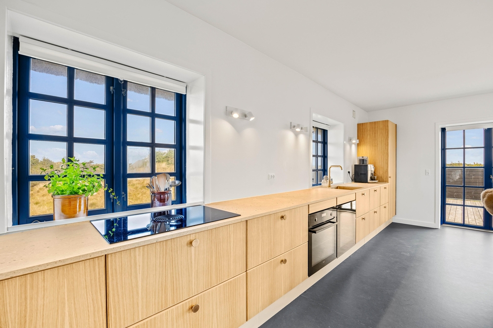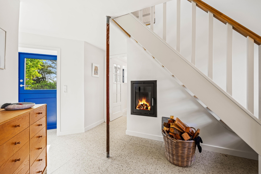 Det veludstyrede køkken har opvaskemaskine, induktionskomfur, vinkøler og en 60-liters fryser, hvilket især vil glæde lystfiskerne blandt jer. De to badeværelser med gulvvarme gør, at I ikke behøver at stå i kø til morgenbadet. Der er brændeovn på begge planer og tre hyggelige soveværelser med komfortable dobbeltsenge, og ét med en køjeseng med to sovepladser. Sommerhuset indeholder også vaskemaskine og energibesparende varmepumpe.