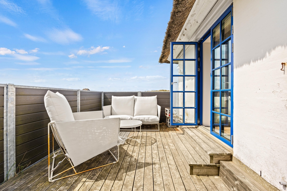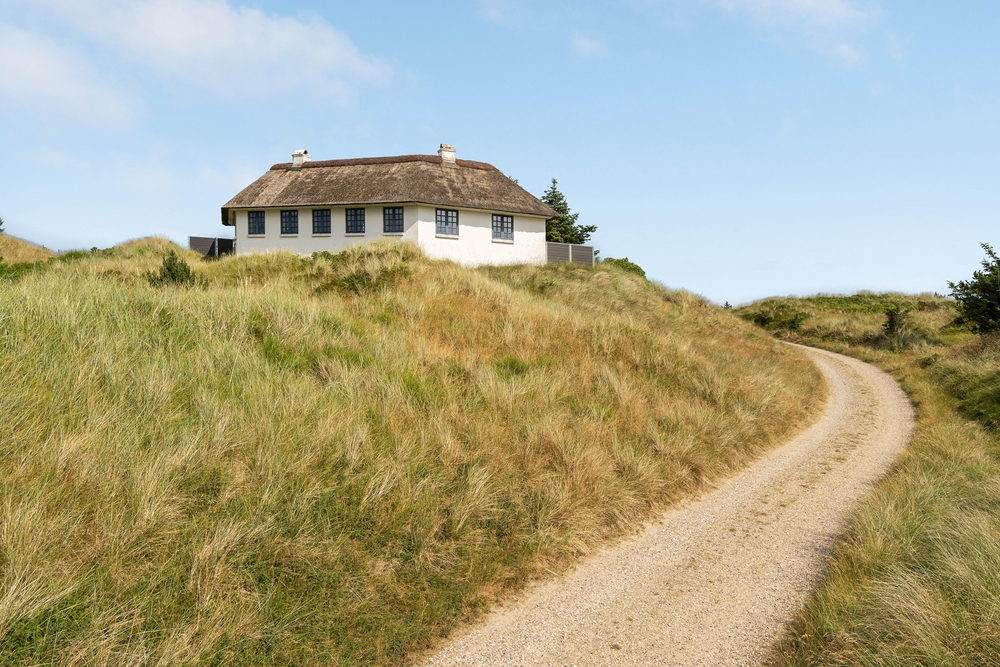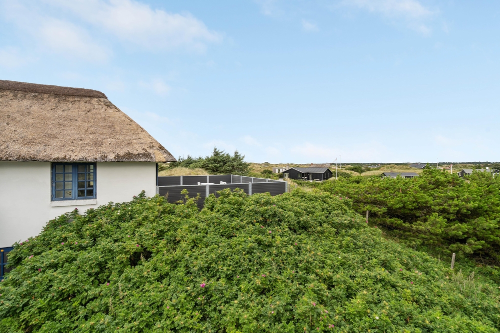 Jeres charmerende og højtbeliggende sommerhus ligger på en kuperet klitgrund på ca. 3000 kvm. De forskellige terrasseområder indbyder til ophold. Afhængigt af solens placering og vindretningen kan I altid finde et sted til afslapning i de komfortable havemøbler. Herfra har I en enestående udsigt over den omkringliggende natur.