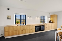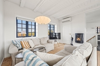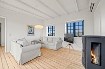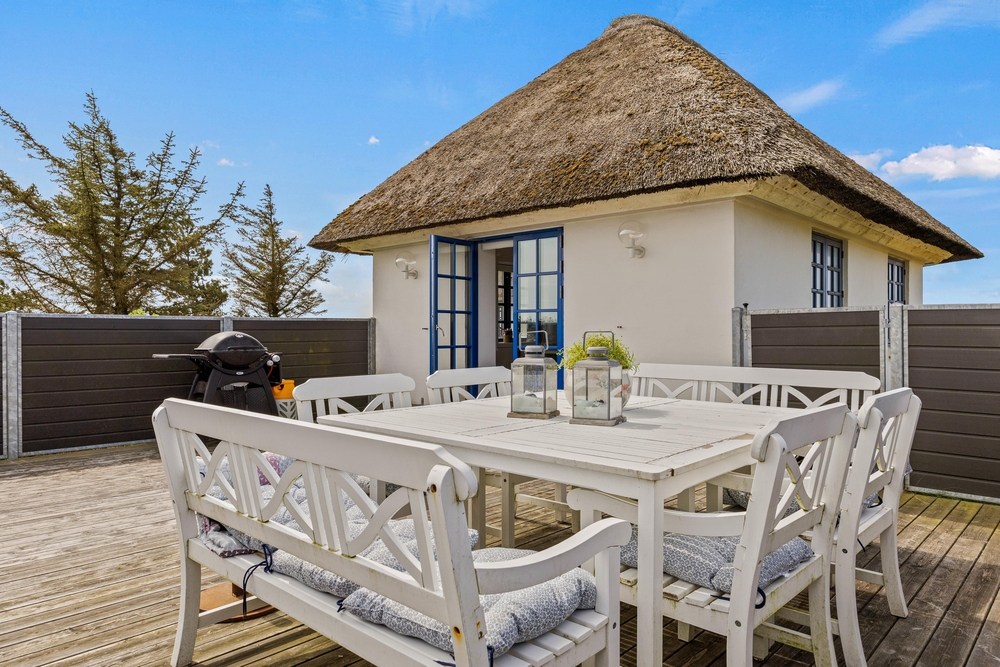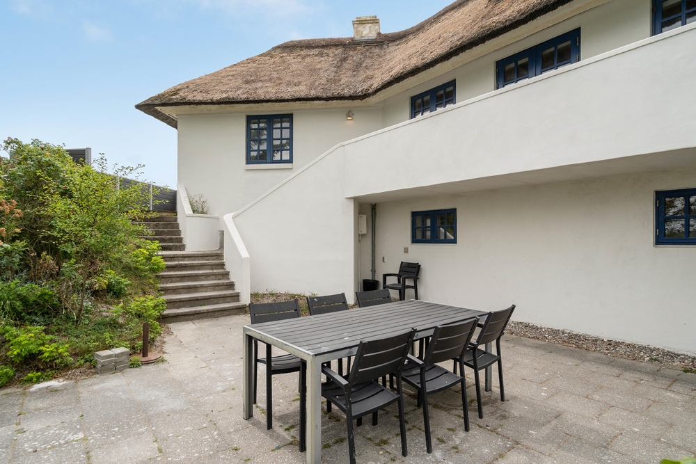 Det smukke stråtækte sommerhus er indrettet med sprossevinduer, synlige bjælker i stuen, bræddeloft og møbler i en dejlig lys sommerhusstil. I opholdsstuen et spisebord med hyggelige siddepladser, sofagruppe og en brændeovn. Her kan I holde en filmaften eller en spilleaften sammen. Sommerhuset er indrettet så man kan være to familier.